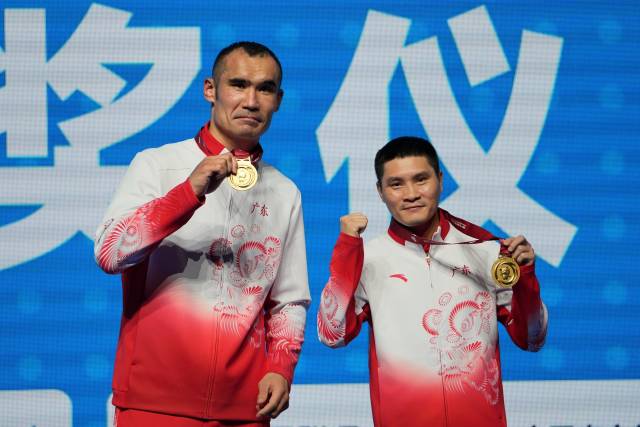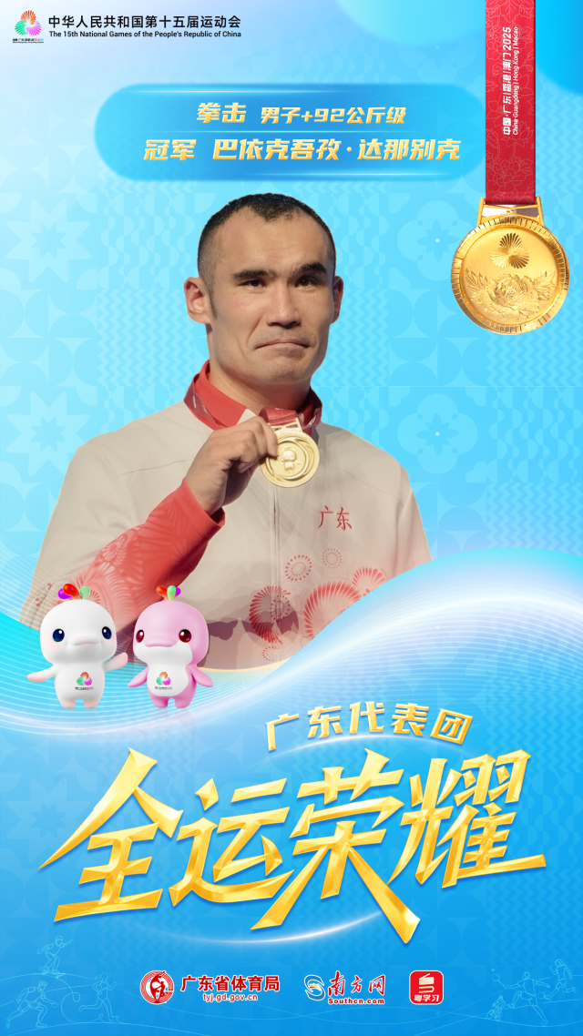 11月12日下午,在十五运会拳击男子 92公斤级决赛中,广东队选手巴依克吾孜·达那别克以稳健的发挥战胜对手,勇夺金牌!