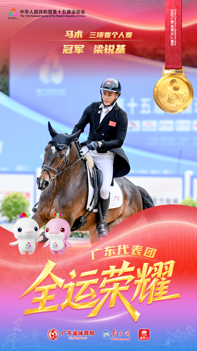 在马术三项赛个人赛中,广东健儿梁锐基以28.8的总罚分夺冠,为广东马术队再添一金!