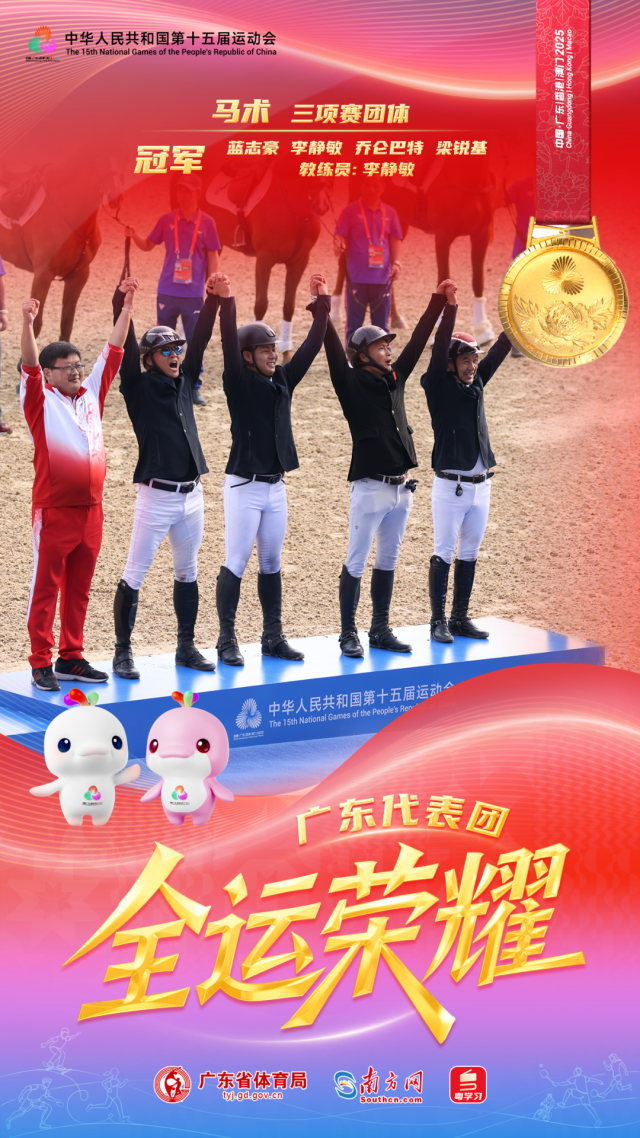 11月15日,十五运会马术三项赛在深圳光明国际马术中心收缰。由梁锐基、李静敏、乔仑巴特、蓝志豪组成的广东队发挥出色,以99.5的总罚分勇夺马术三项赛团体金牌。