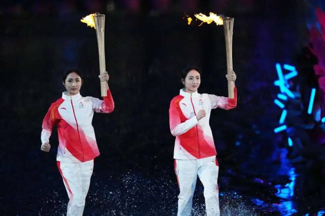 11月9日,第十五届全国运动会开幕式在广东奥林匹克体育中心举行。火炬手王柳懿、王芊懿传递火炬 图/新华社