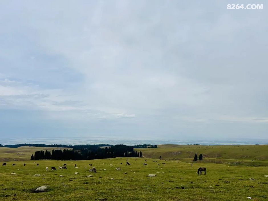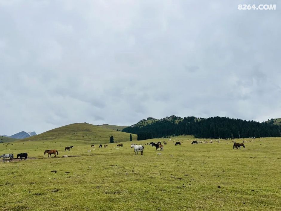 穿过一片茂密的云杉林后,视野变的开阔,漫山的牛马、还有羊群,装饰了我们对草原的印象。