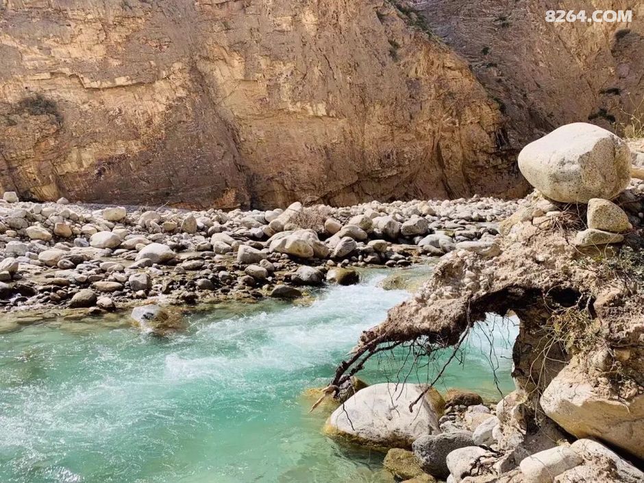 河水非常清澈,阳光下犹如宝石般青翠欲滴。岸边石壁上纵横交错的褶皱与纹理如同史书一般晦涩,在午后斜照下泛着青铜般的光泽。河岸碎石滩上大片的石头杂陈,每一颗都带着流水抚摸过的痕迹。
