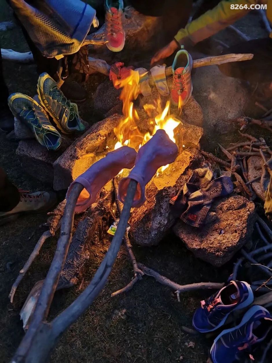 天黑了,气温降得很低。领队如风和涅槃贴心地在河边给我们烧了一堆火!这可真是雪中送炭啊,大家不约而同地缩在篝火旁烤火,顺便烤鞋子烤袜子!