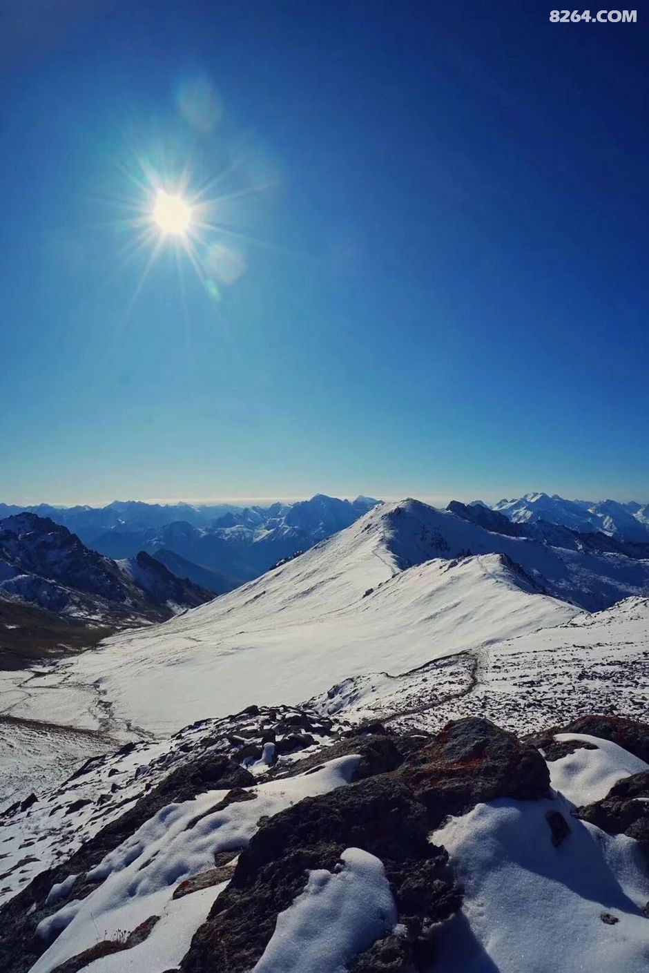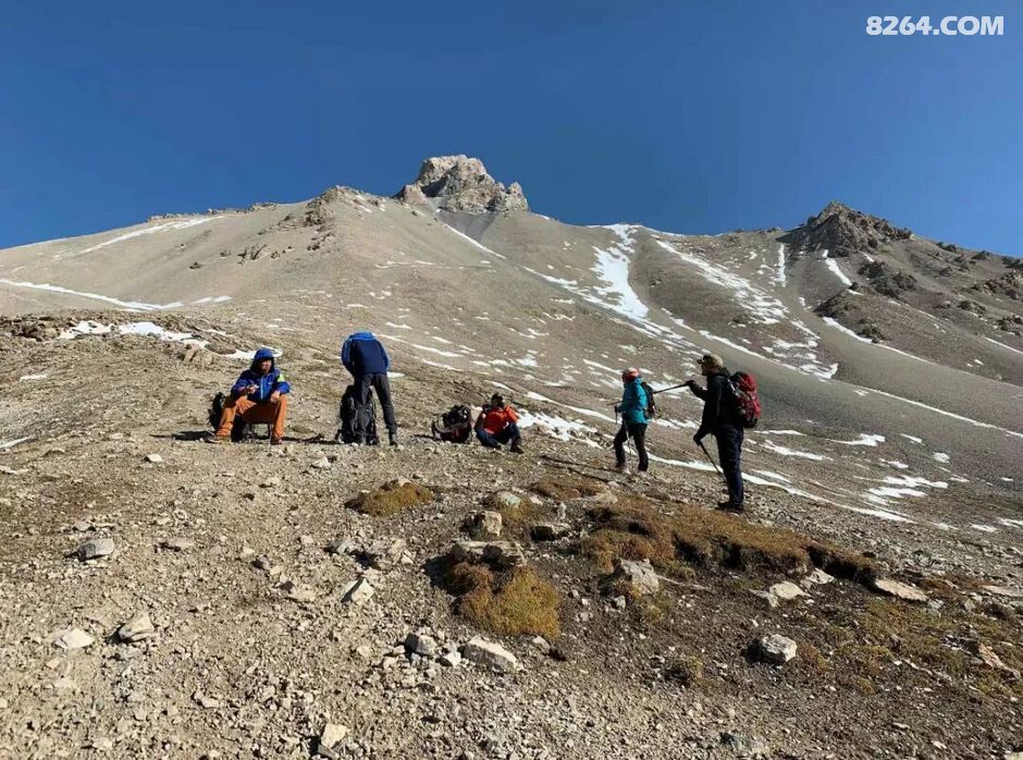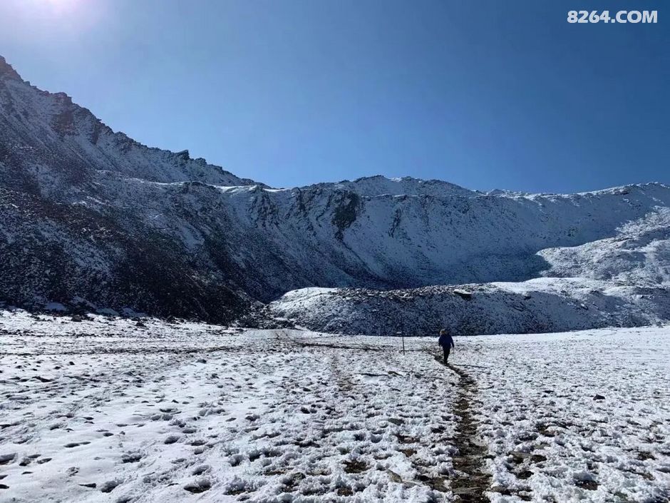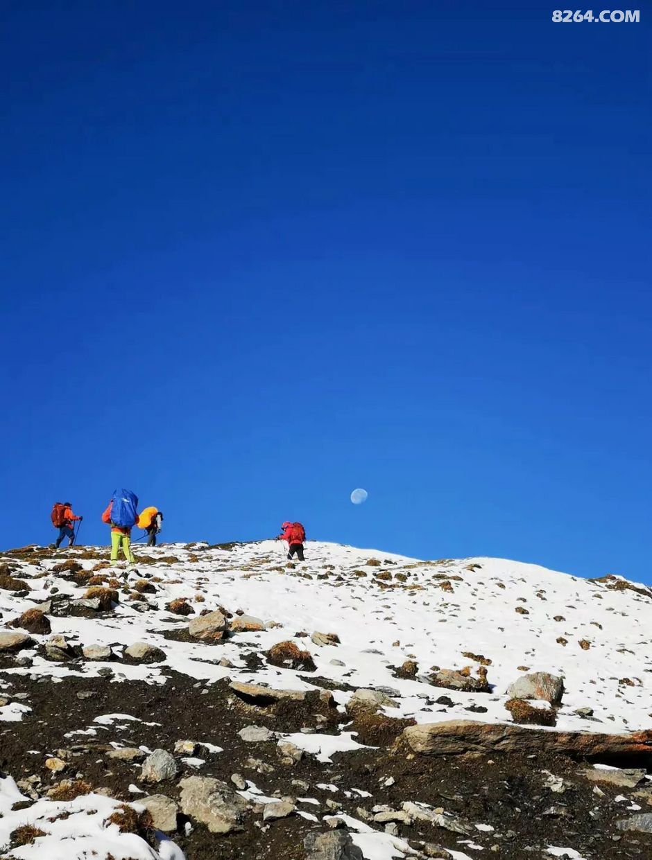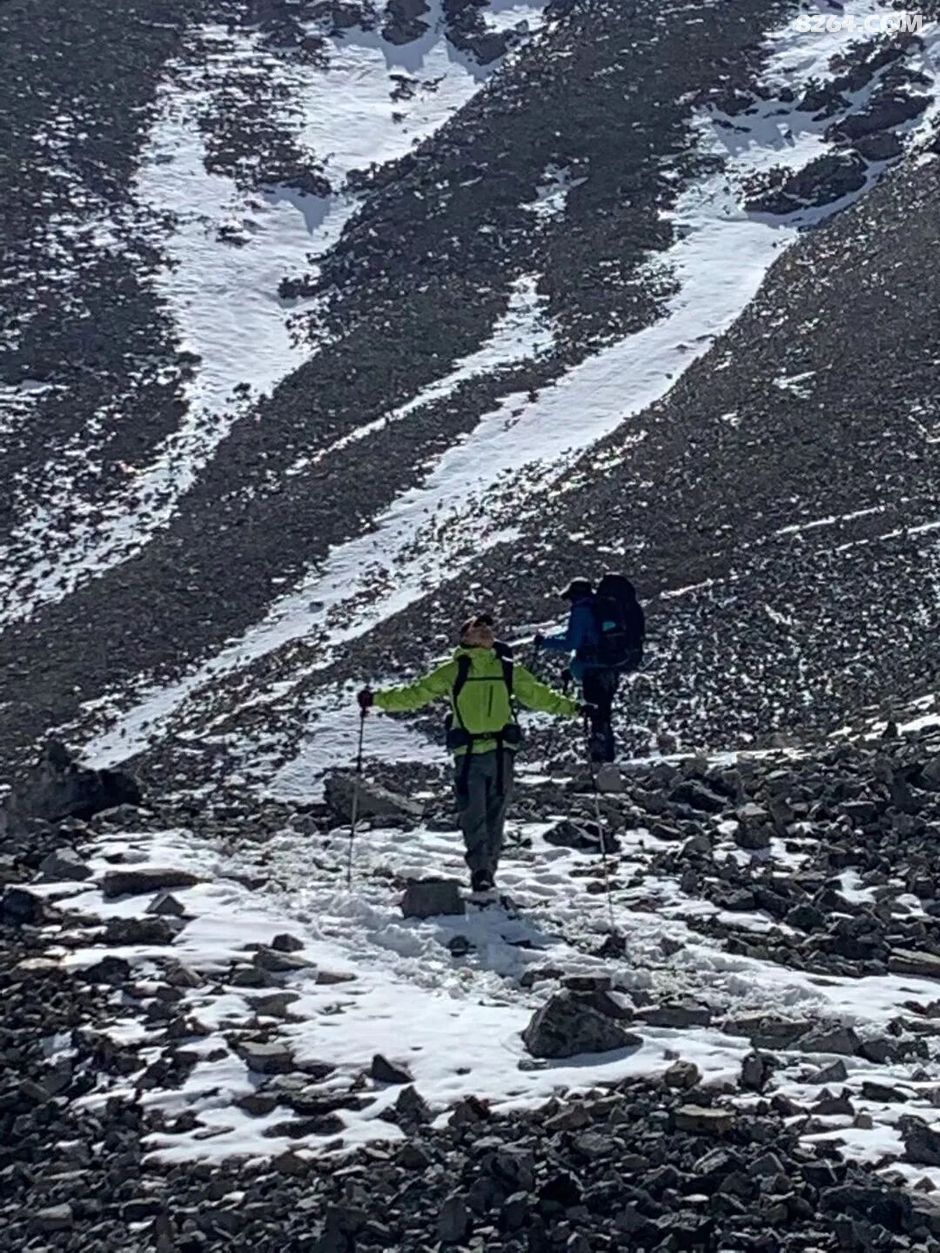 早上开始出发便一路上行,越往上走,绿色渐渐消失……一眼望去,湛蓝的天空之下几乎全是积雪点缀中的碎石山峰!