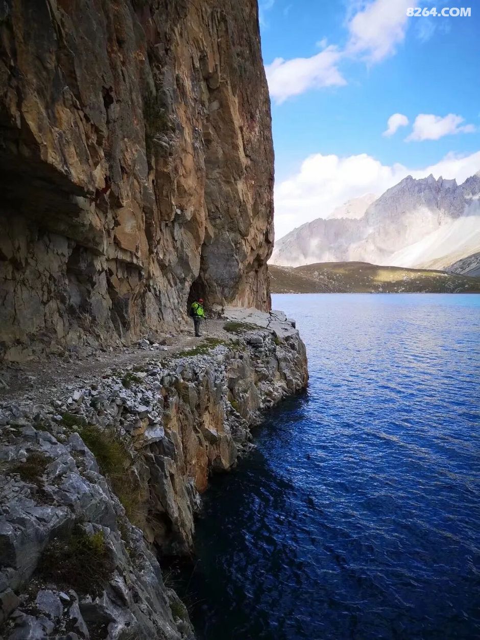 湖边一侧紧贴着石壁山崖,被牧民开凿出一条窄窄的马道:一面暗黄一面蔚蓝,一面沧桑一面浪漫,一面侠骨般的坚毅一面水漾的柔情……大自然为我们展示出最动人心魄的美!
