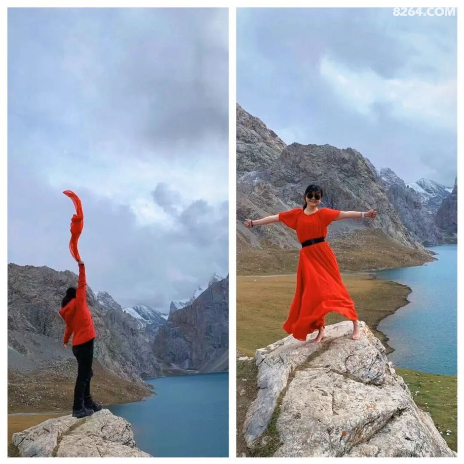 扎好帐篷,我赶紧鼓动“高兴”陪我一起到湖边拍照:我带上了大妈标配的红纱巾,也穿上了同行兔子草姐借给我的红裙子!