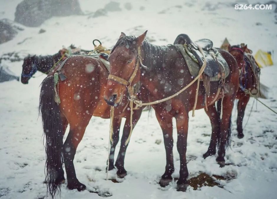 风雪中,马群挤在一起眯着眼睛半垂着脑袋一动不动地静默着,有一种说不出的萧瑟之感。突然想起边塞诗人岑参的那两句:“九月天山风似刀,城南猎马缩寒毛”,好应景!