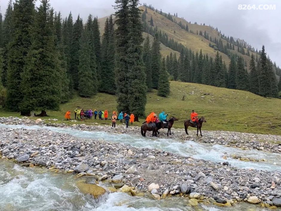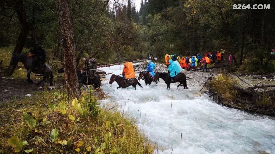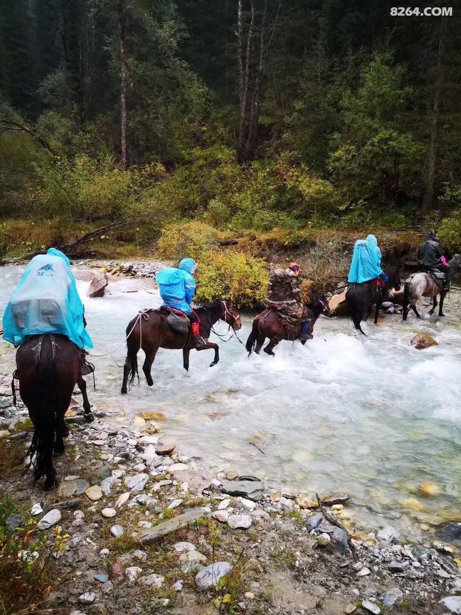 因为下雨,今天要过的7条河水势大涨,涉水渡河风险加大。而且,大家已经在雨雪中徒步了大半天,又湿又冷,所以一致同意领队的意见:骑马过河。