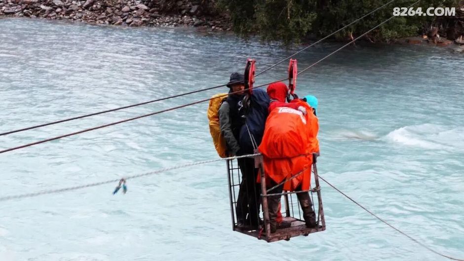 奔涌的河面上一个简易的金属方框里一次可以装三个人,两岸都有牧民来回拉索。虽然摇摇晃晃地有点惊悚,不过还算安全。