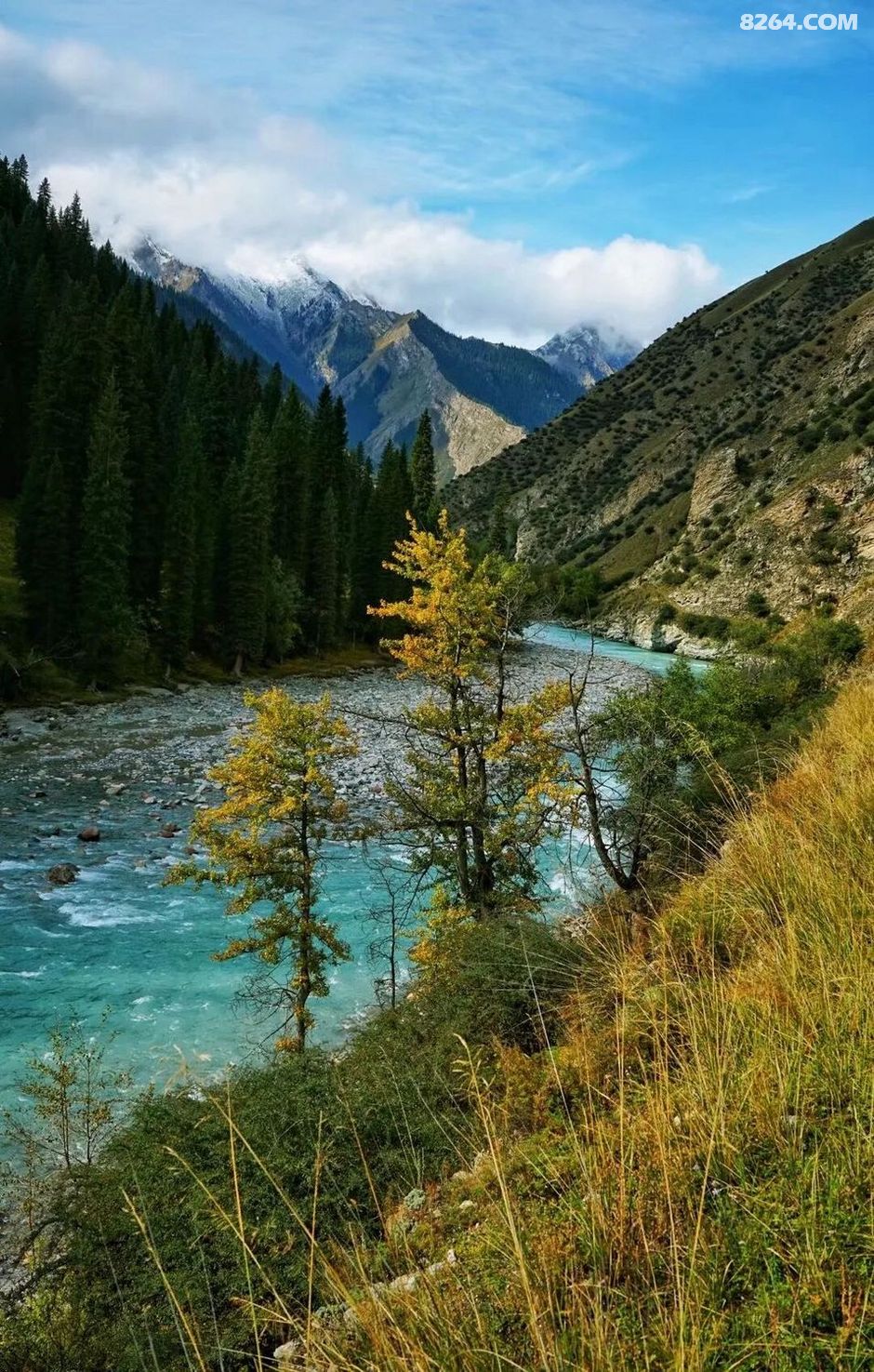 一侧山梁上笔直的云杉像列兵一样排列整齐刺向天空,深邃的绿意与连绵的金黄形成鲜明对比,如同一片巨幅的织锦地毯,一直铺到远山之际。