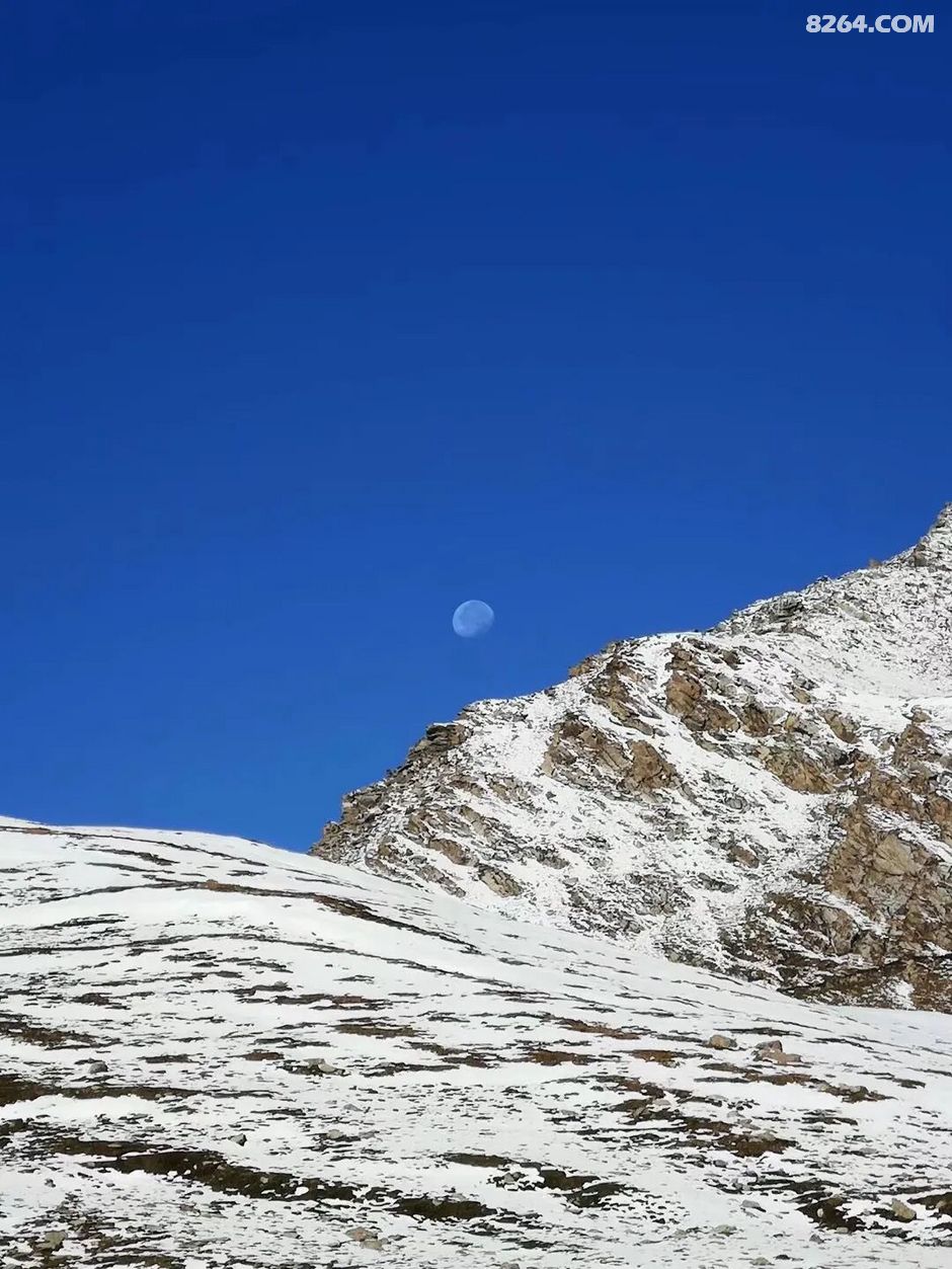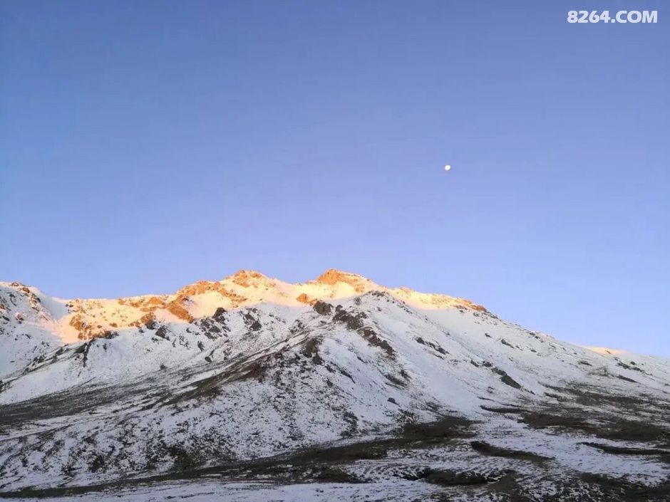 月亮还未退下,太阳却已经照在了雪山上。天气如此晴朗,让我的心情也振奋了许多!