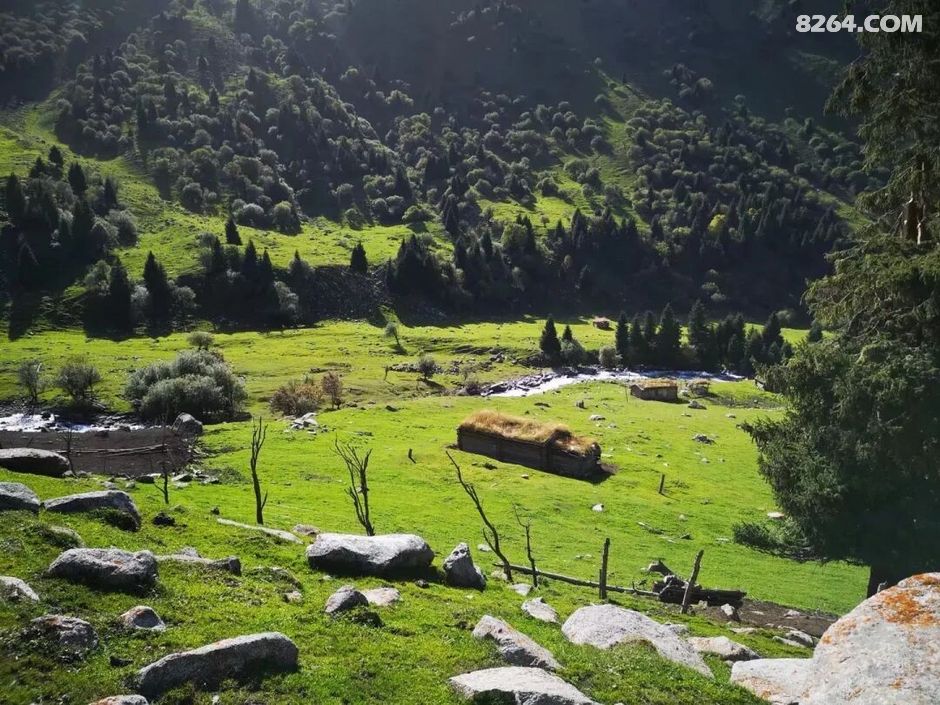 屋顶长满草的小木屋、绿意盎然的草场、奔腾不息的河流、高大而茂密的树木……北疆的勃勃生机铺陈开来!