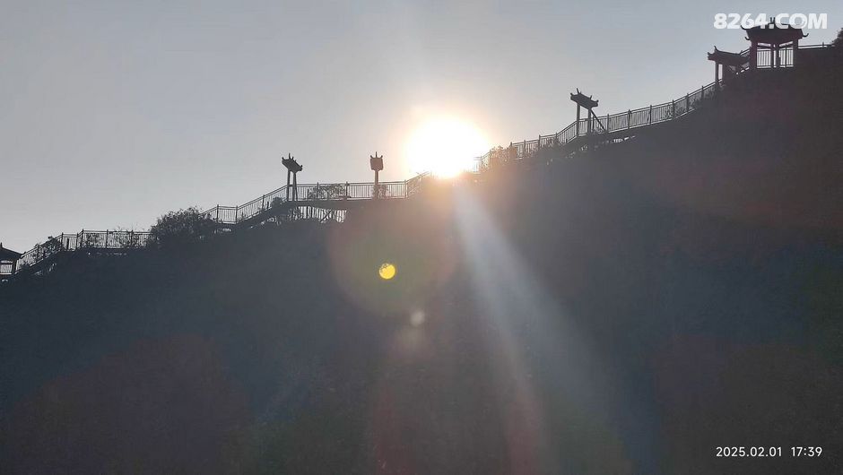 日出时分,阳光透过云层照射出来,在山顶上形成一道美丽的光束。远处的亭子和栏杆等建筑设施像是点缀在这幅画卷中的小品,为这壮丽的景色增添了几分人文的气息。