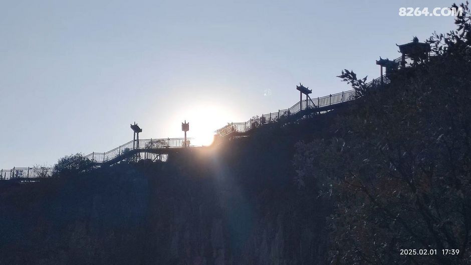 观景台上的亭子位于悬崖峭壁之上,远处群山环绕。那亭子像是一个连接人与自然的桥梁,让人们可以在这里尽情欣赏这壮丽的景色。