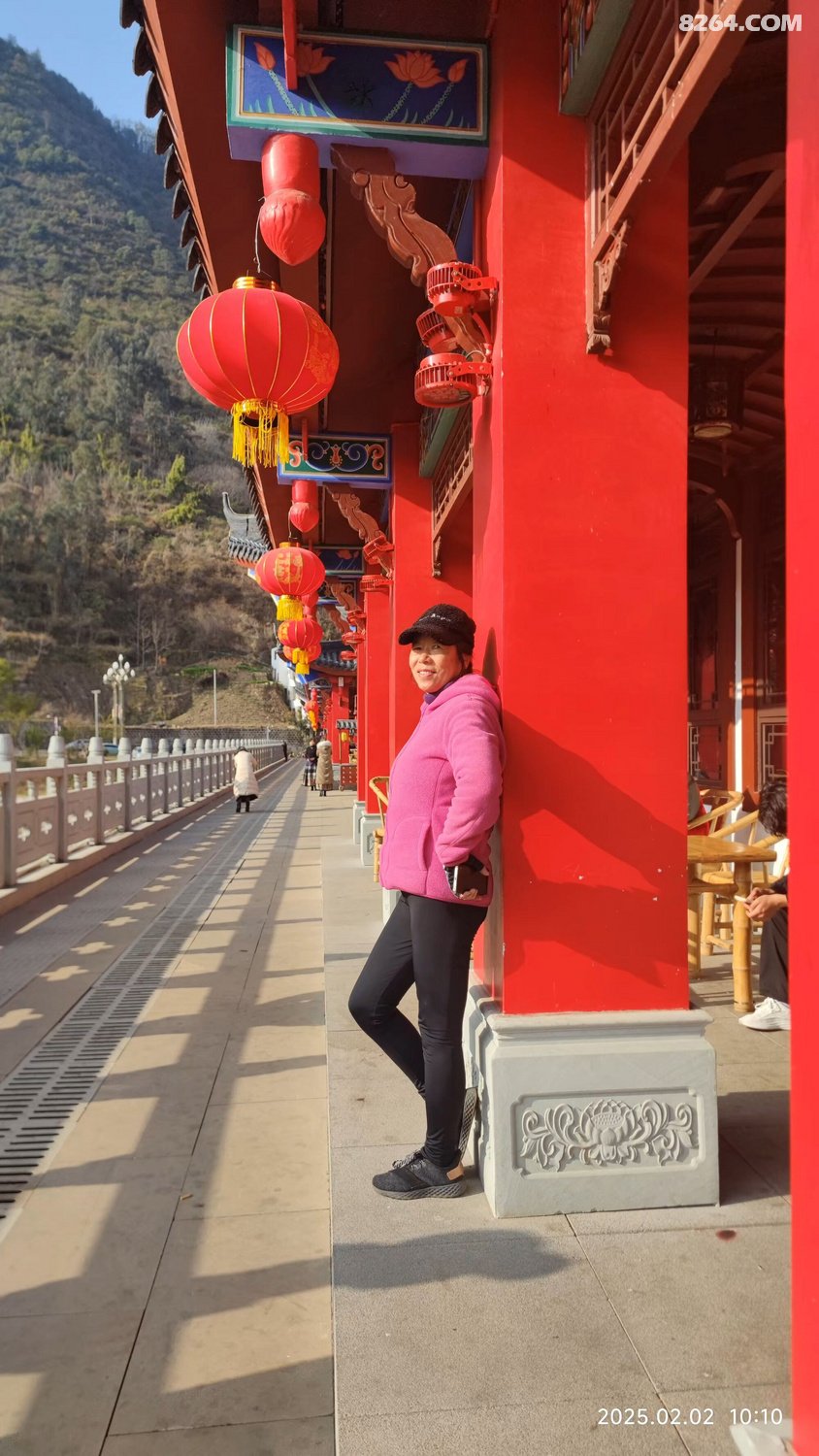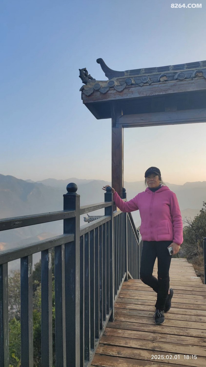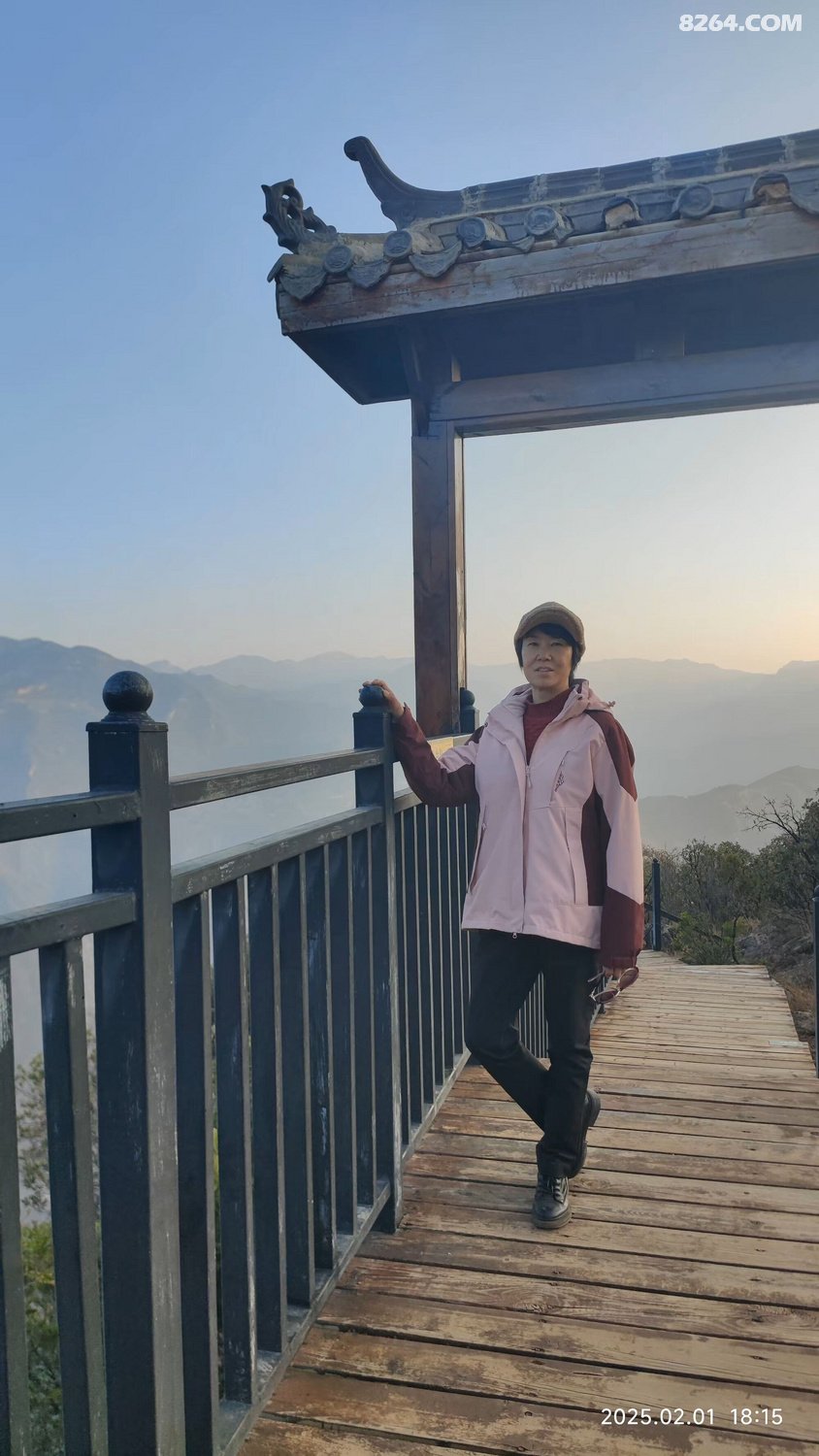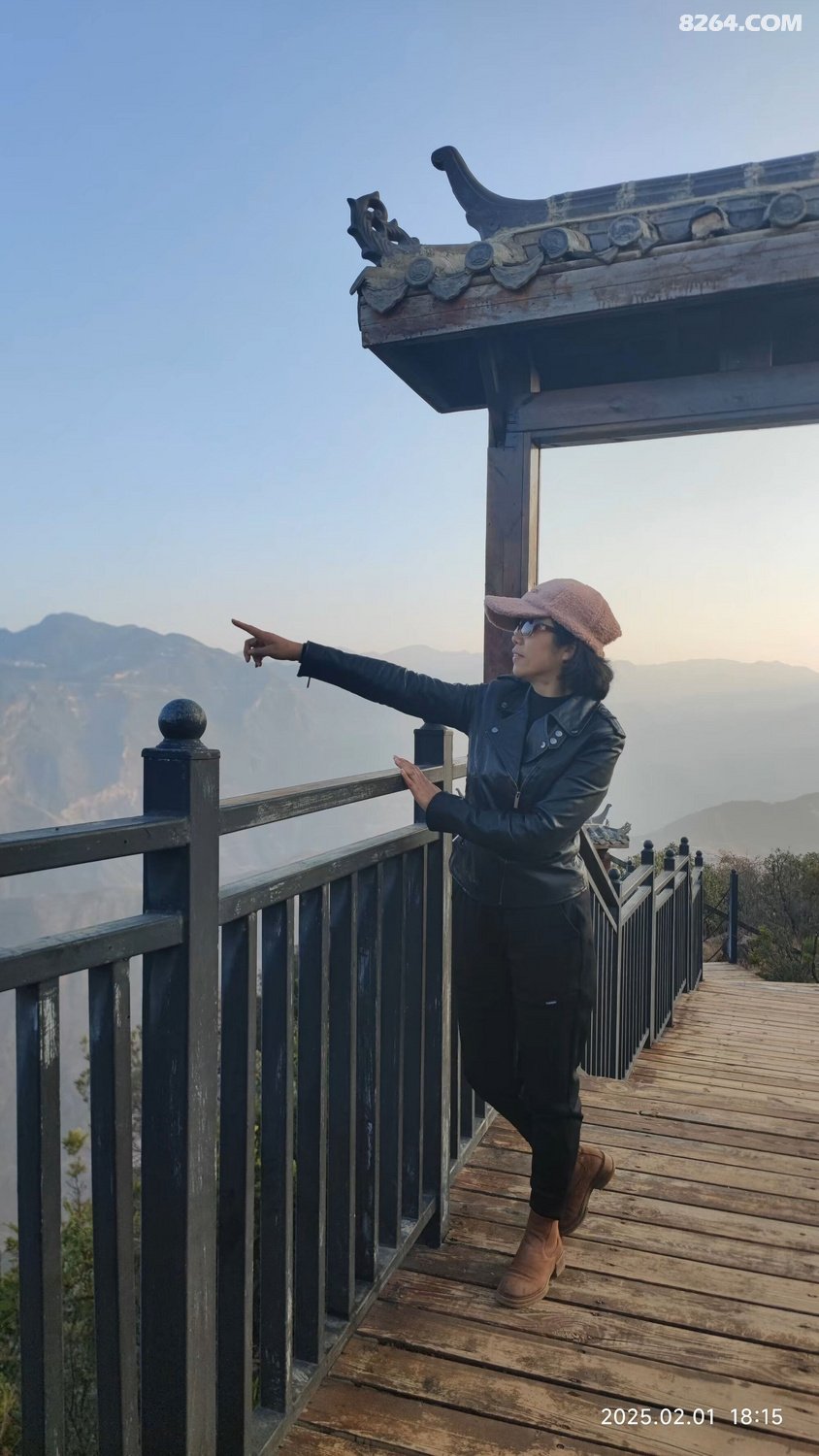 站在观景台上的身影,身穿粉色上衣黑色裤子,并戴着一顶帽子,背对着镜头看向远方的大好河山。那身影仿佛与这景色融为一体,成为这美景的一部分。