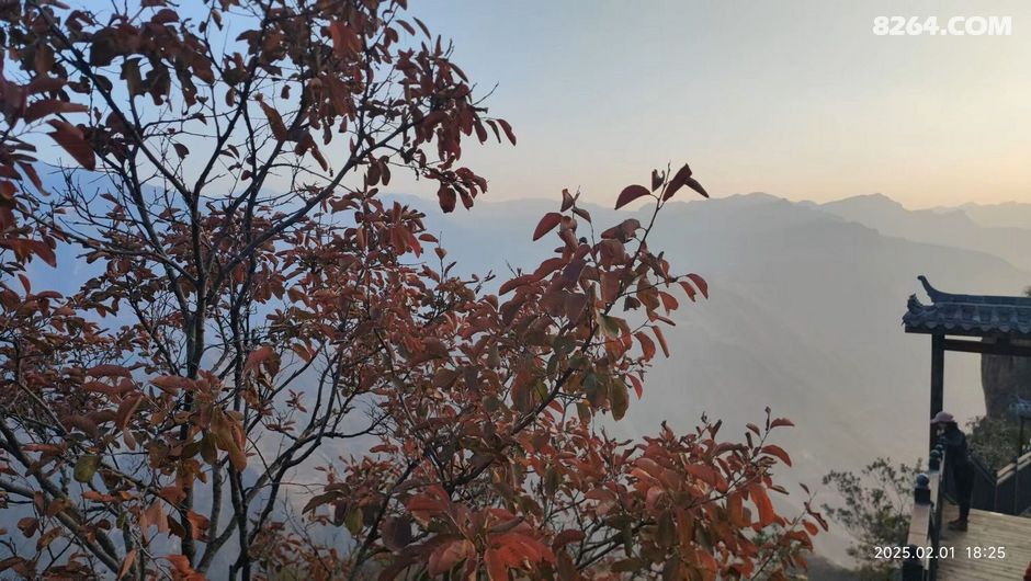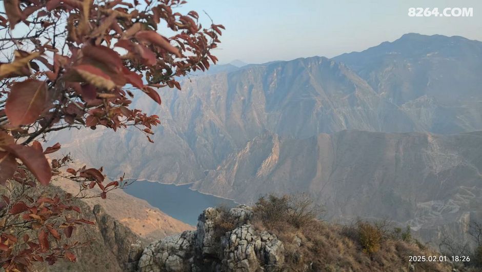 山景中,前景有一棵红叶树干枝,远处群山连绵起伏。那红叶树像是大自然在这个季节里的一抹亮色,与远处的群山共同构成了一幅美丽的画卷。