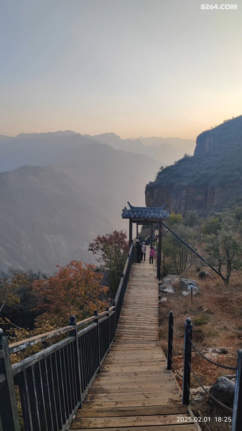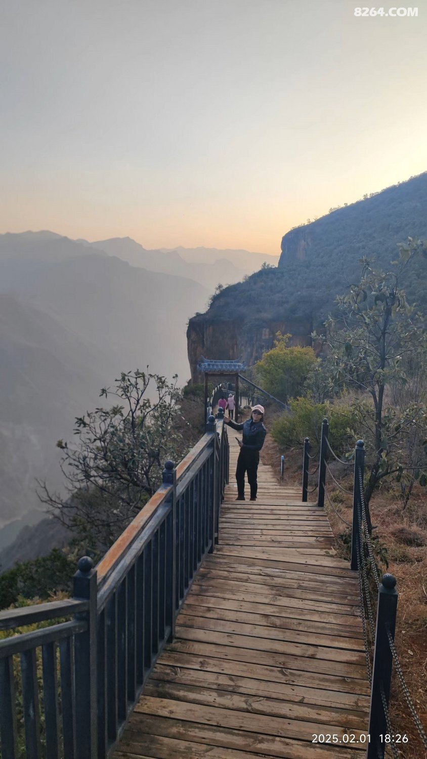 木制栈道位于山崖之上,栈道一侧装有护栏,游客们沿着栈道前行,在欣赏美景的同时也保障了安全。这栈道像是连接人与自然的纽带,让人们可以更近距离地感受这美景。