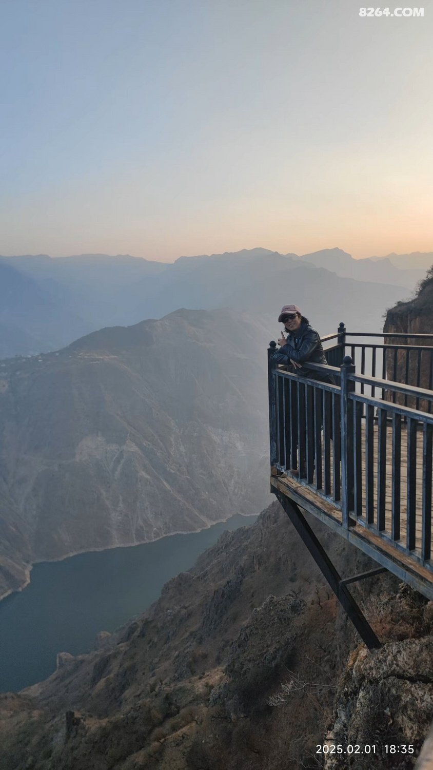站在木制栈道上,穿着黑色外套和牛仔裤,戴着帽子,并用手扶着栏杆看向远方。那远方的美景让人陶醉,仿佛所有的烦恼都被这美景所驱散。