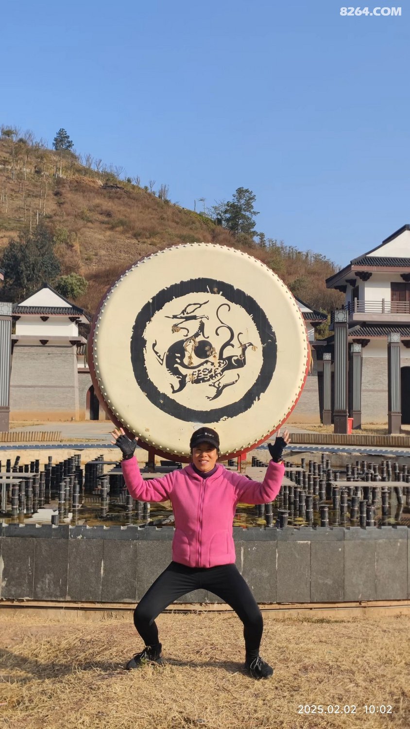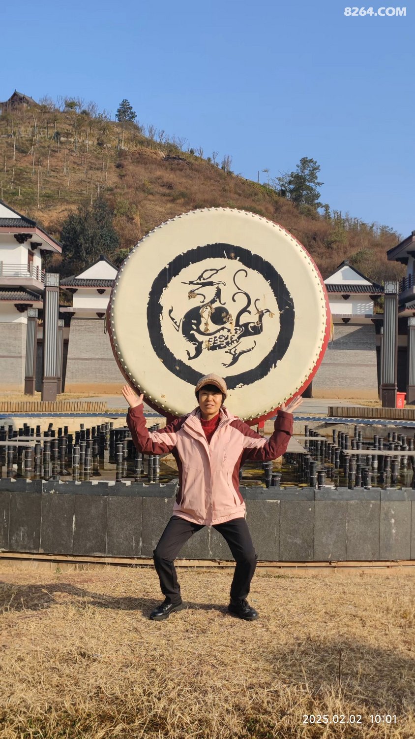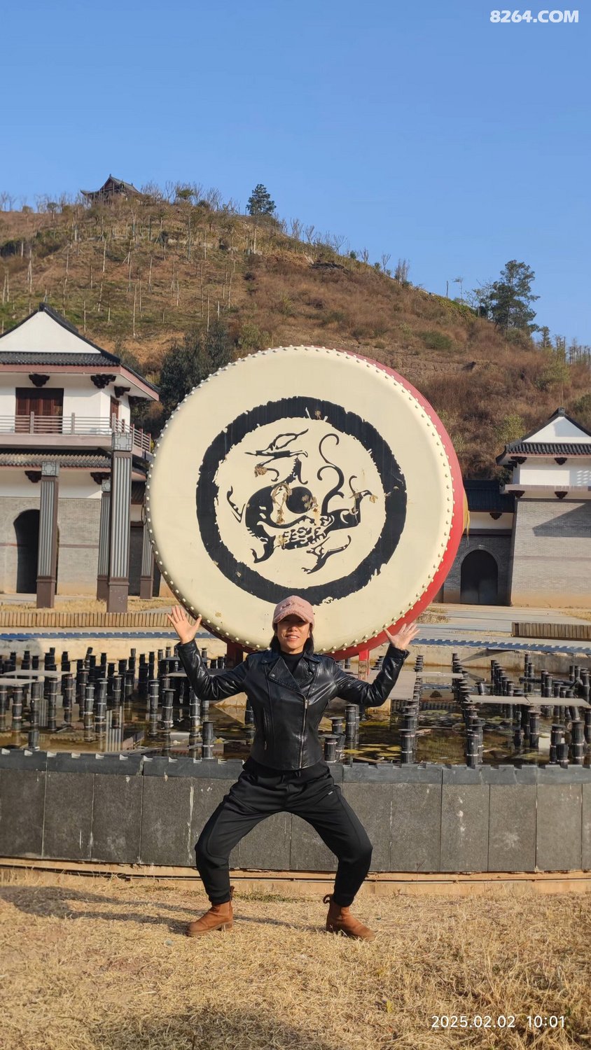 我站在木质栈道上,穿着黑色皮衣搭配粉色帽子,右手比划着指向远方的动作,似乎是在向人们介绍眼前的美景。这美景让我陶醉,我想要让更多的人看到这片土地的魅力。