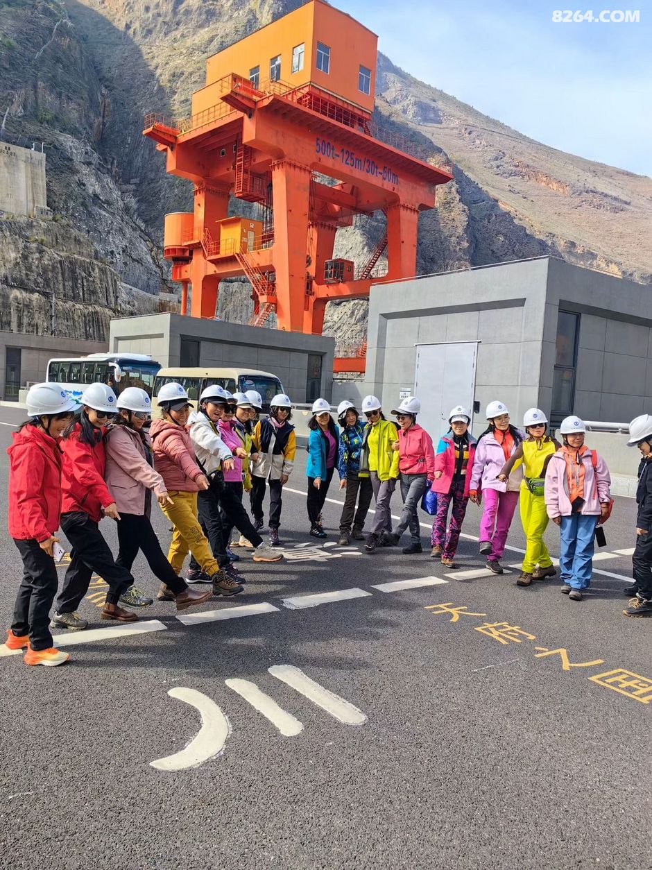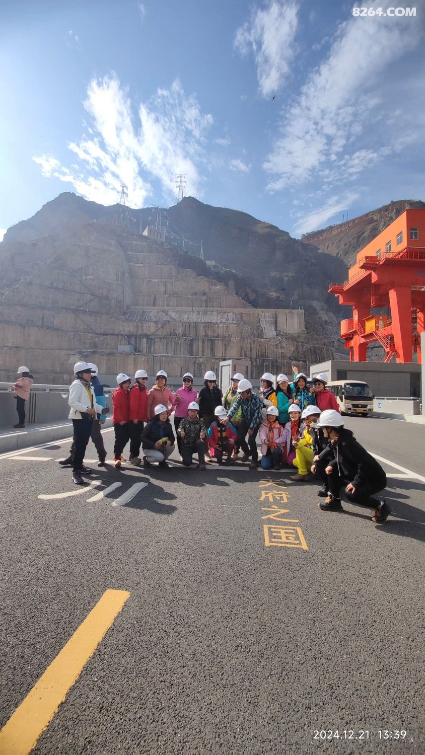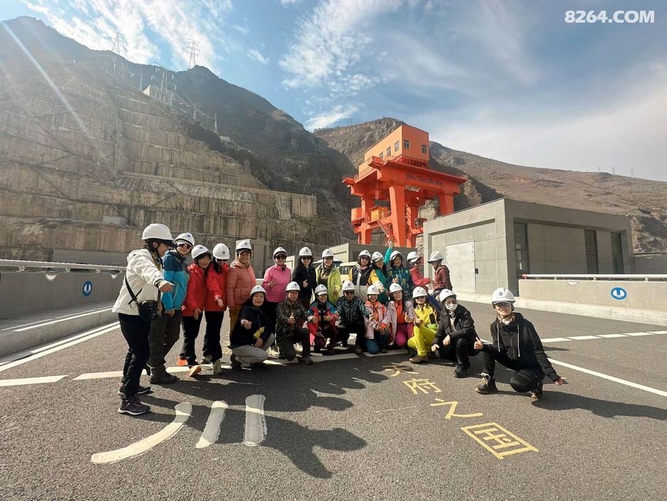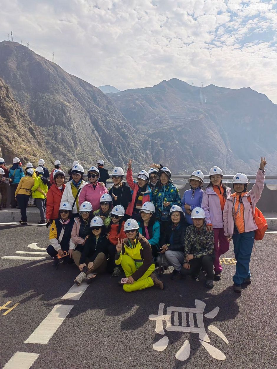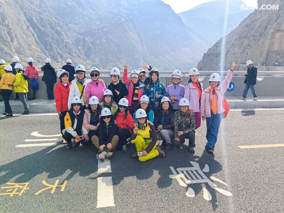 一群人戴着白色安全帽站在道路旁合影留念,他们面带微笑看向镜头。背景是一座大坝以及远处连绵起伏的大山。这一刻,时间仿佛静止了,所有的美好都被定格在这张照片里。我看着他们的笑容,感受到了一种团结的力量,这种力量支撑着我们继续向前探索这片神奇的土地。