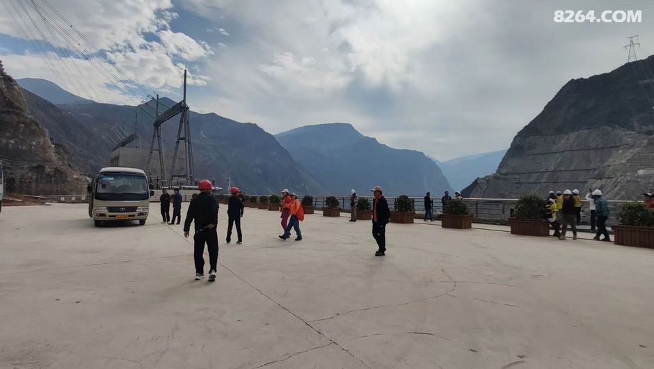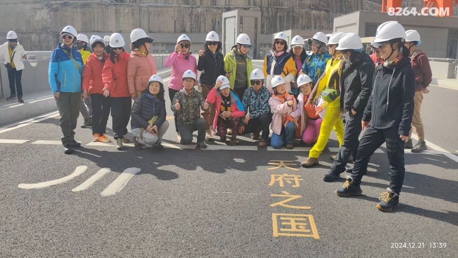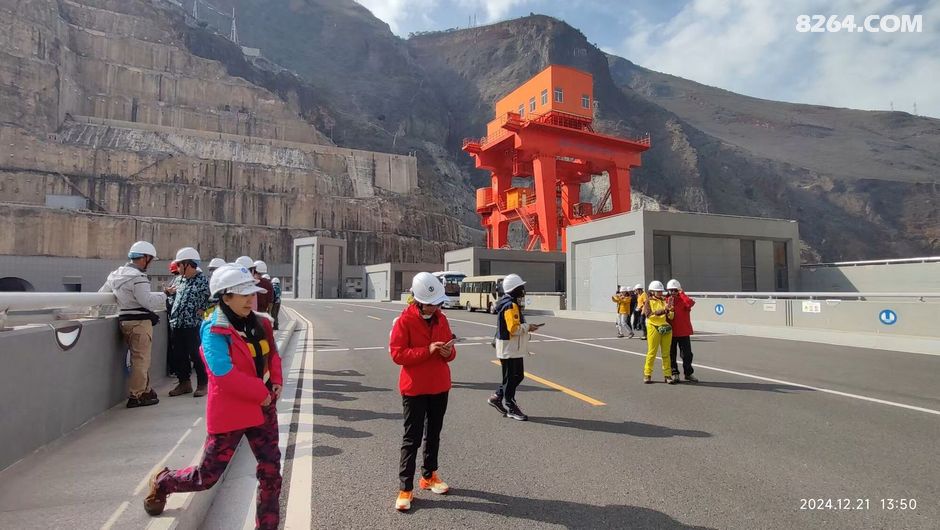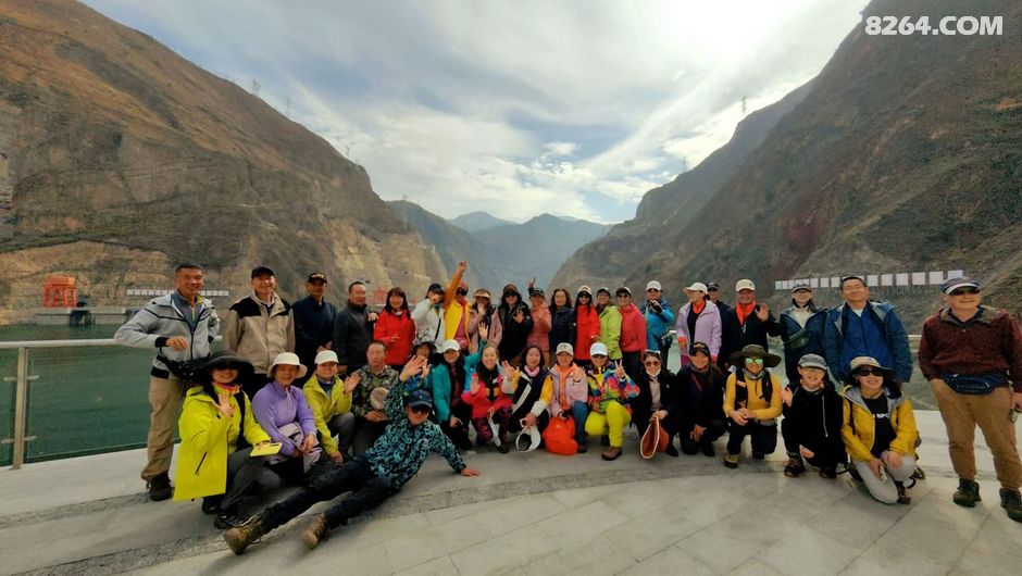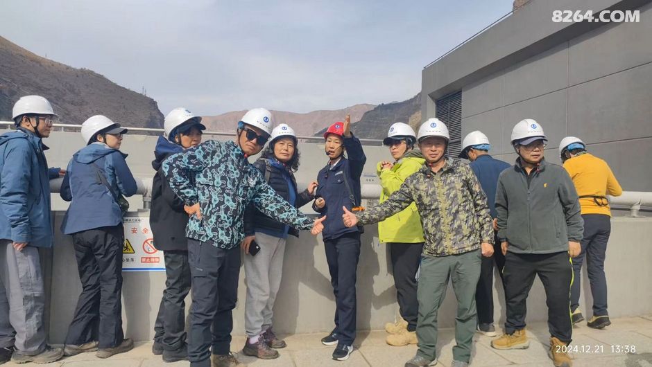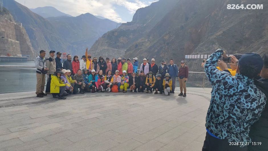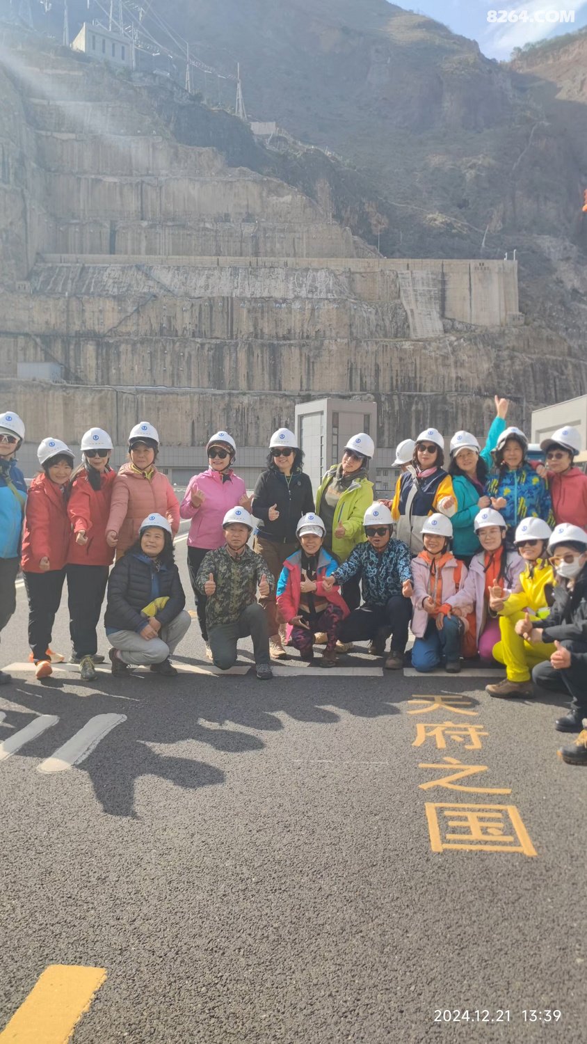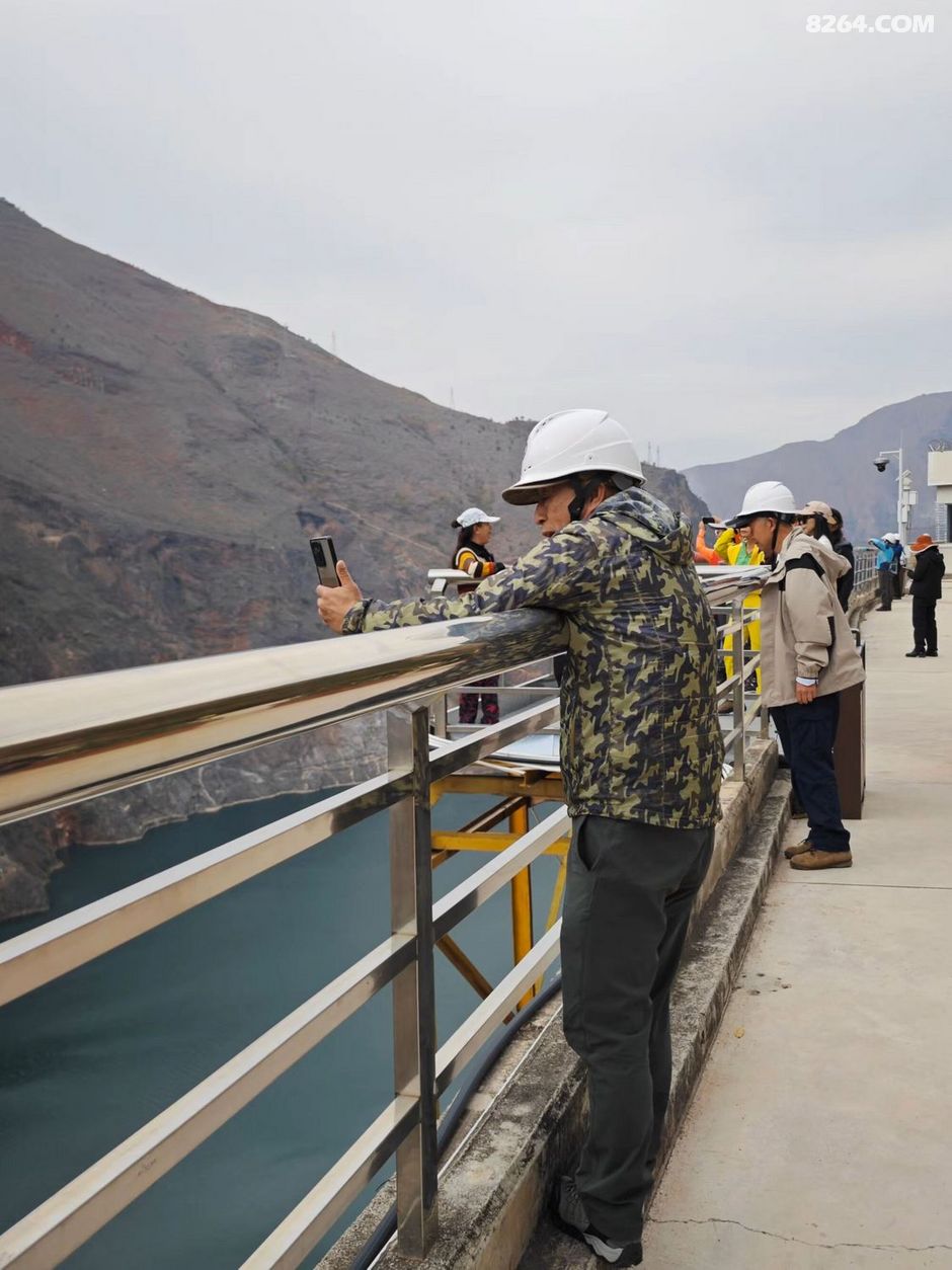一群人戴着白色安全帽站在道路旁合影留念,他们面带微笑看向镜头。背景是一座大坝以及远处连绵起伏的大山。这一刻,时间仿佛静止了,所有的美好都被定格在这张照片里。我看着他们的笑容,感受到了一种团结的力量,这种力量支撑着我们继续向前探索这片神奇的土地。