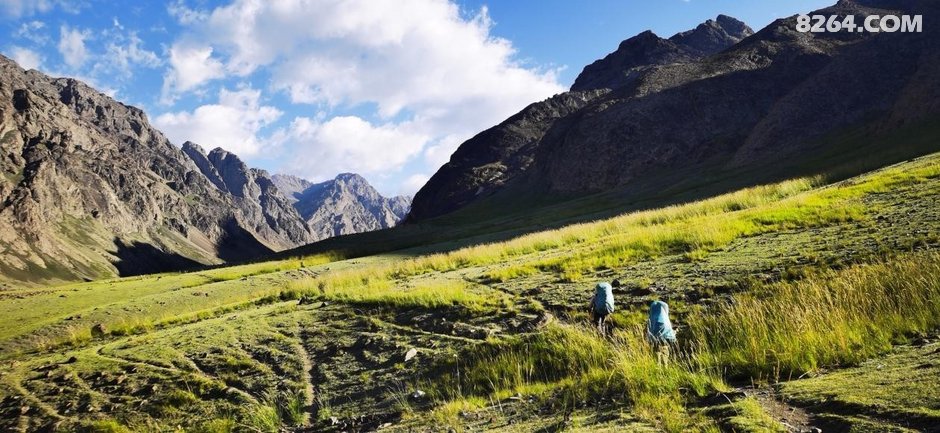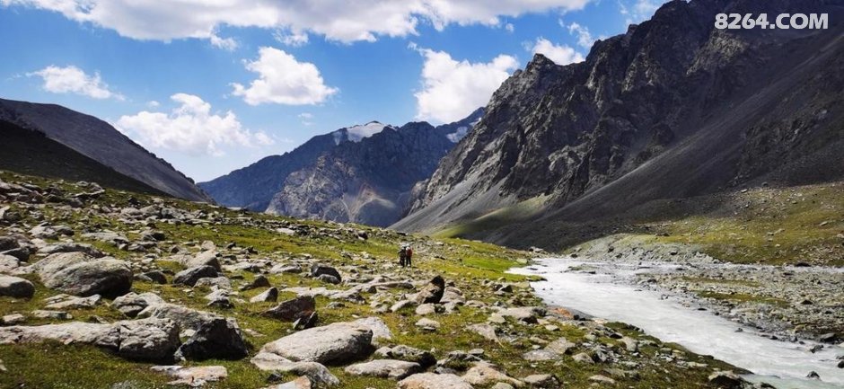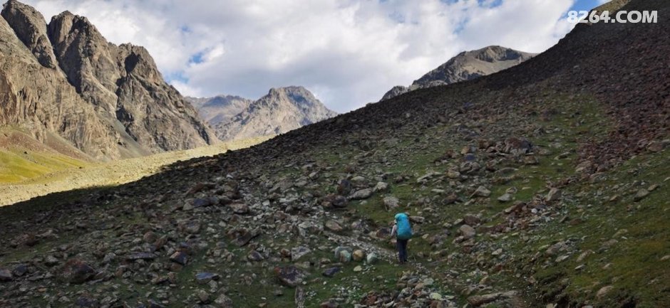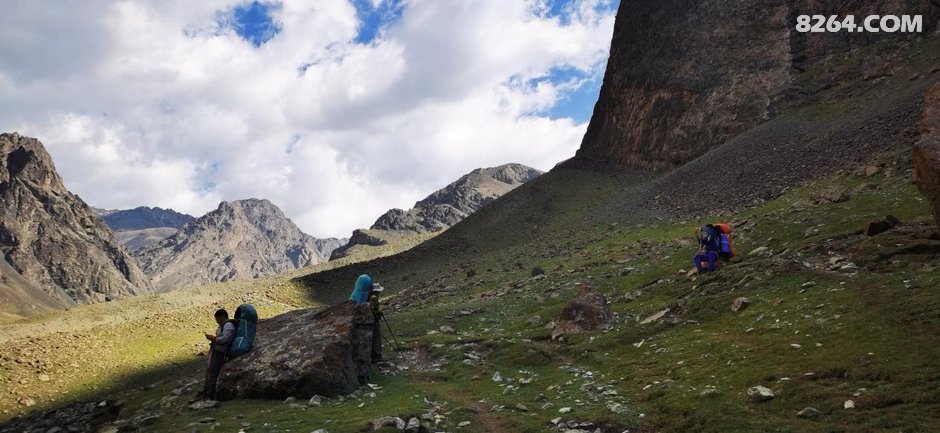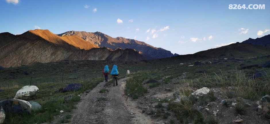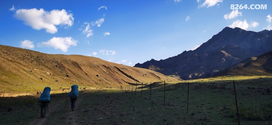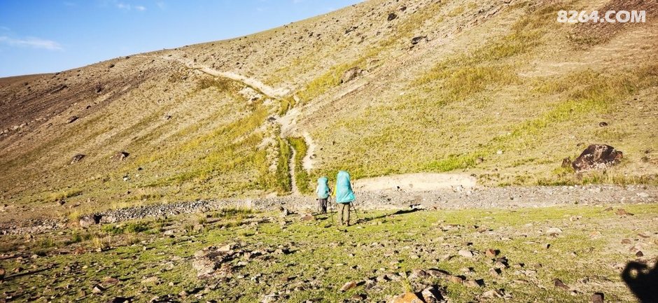 回拍山谷,看见两山友移动的身影(拍摄时间:8:40) 我们沿牧道横切缓坡,逐渐向阿克苏河谷靠近。
