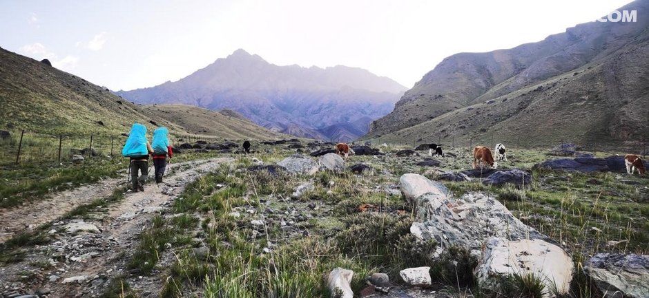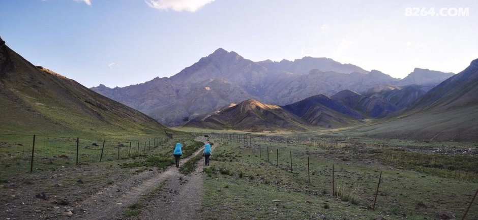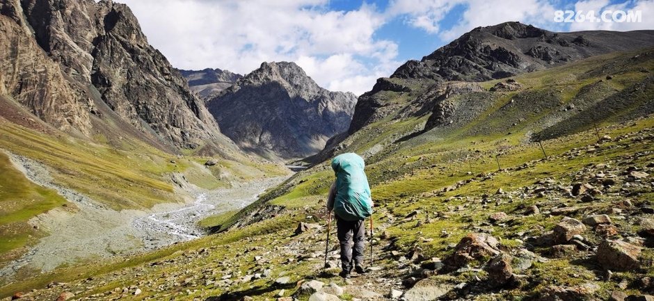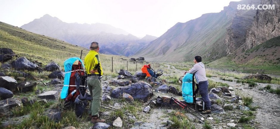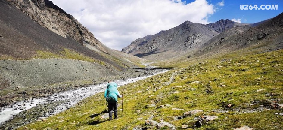 两位大神也知道热了(拍摄时间:8:04)为了每晚能吃上一顿丰盛的晚餐,我们这次的负重远超以往:我的包里塞满了蔬菜和水果,咖啡的高压锅装满肉类和调料,冉苒则背了七八斤大米。还有他们悄悄躲过安检带的贵州酒,以及我昨天刚买的伊力特曲。 山谷越发开阔平坦,咖啡和冉苒仍保持着较快的节奏。路旁小溪已有细流,开阔处出现了一圈牛栏。我提议洗把脸休息片刻,但他们并没有停下的意思。直到一个岔路口,大家才放慢脚步,查看轨迹确认方向。