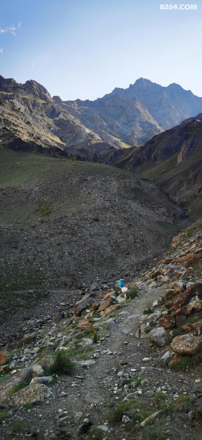 阿克苏河,深切山谷,河滩分布少量乔木(拍摄时间:7:32) 砂石牧道渐渐伸入右侧浅谷,地势缓缓升高,视野也越来越开阔。咖啡和冉苒走得很快,我渐渐有些跟不上。心里暗想:毕竟比我年轻几岁,脚力果然更胜一筹。