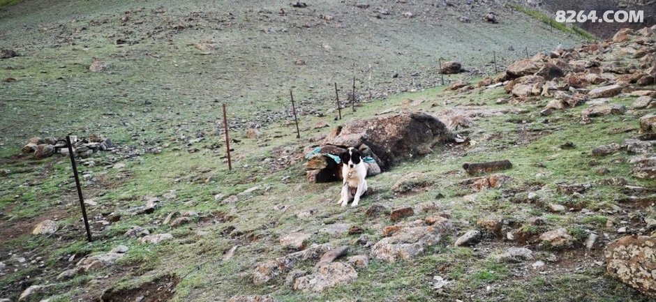 牧场主人并未现身,唯有一只牧犬拴于大石旁。它朝着我们这群不速之客象征性地低吠两声,便安静下来,伏在草地上投来注视的目光。