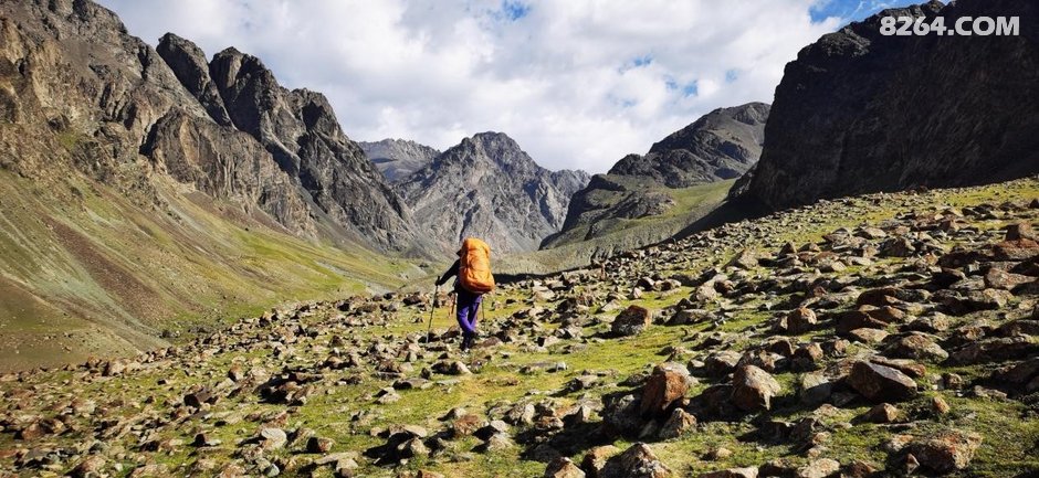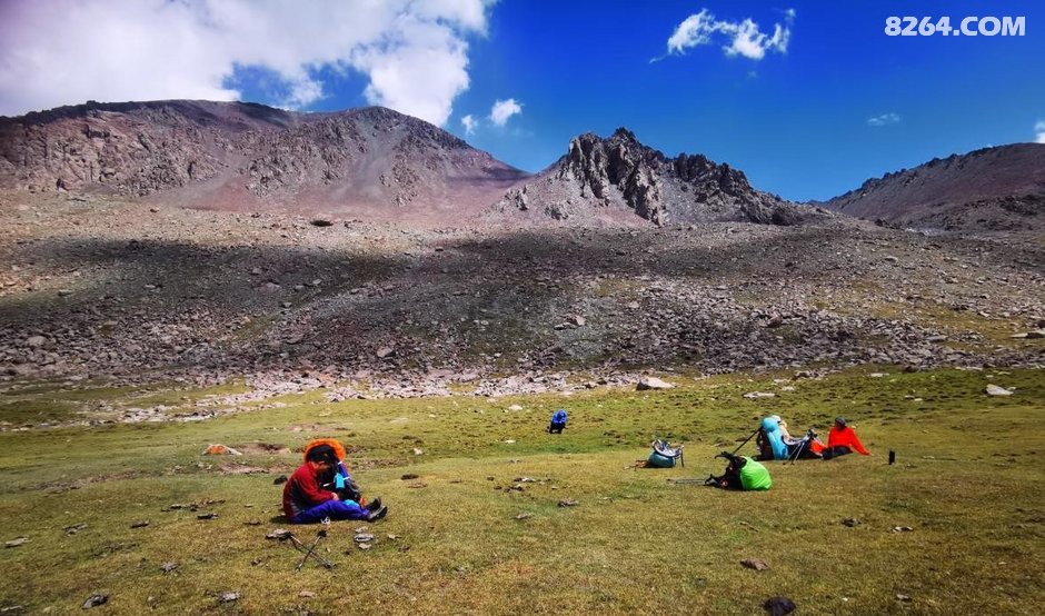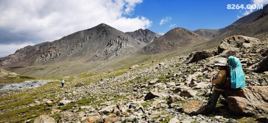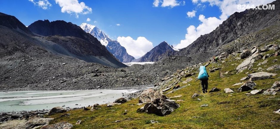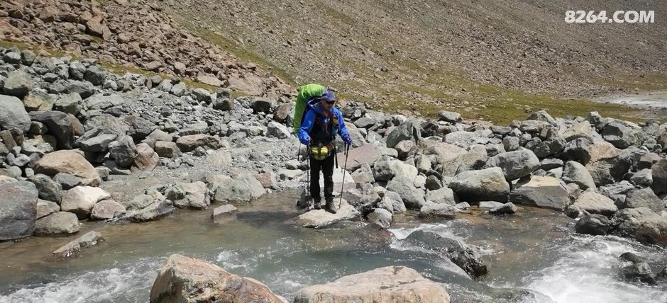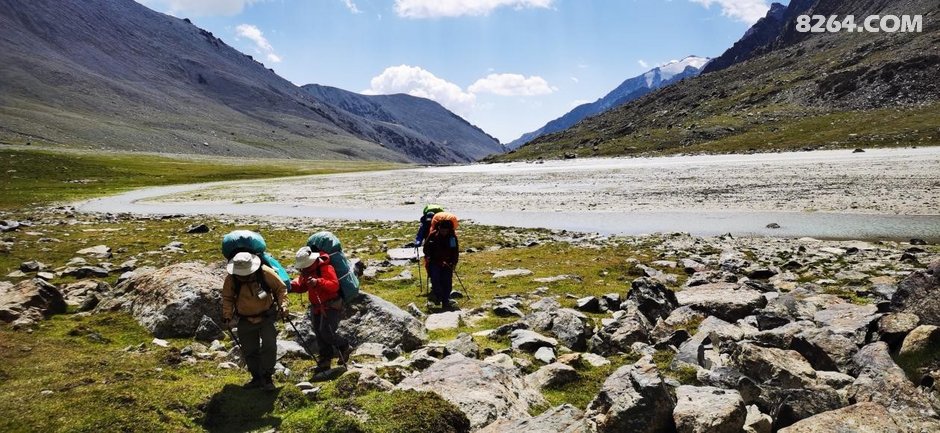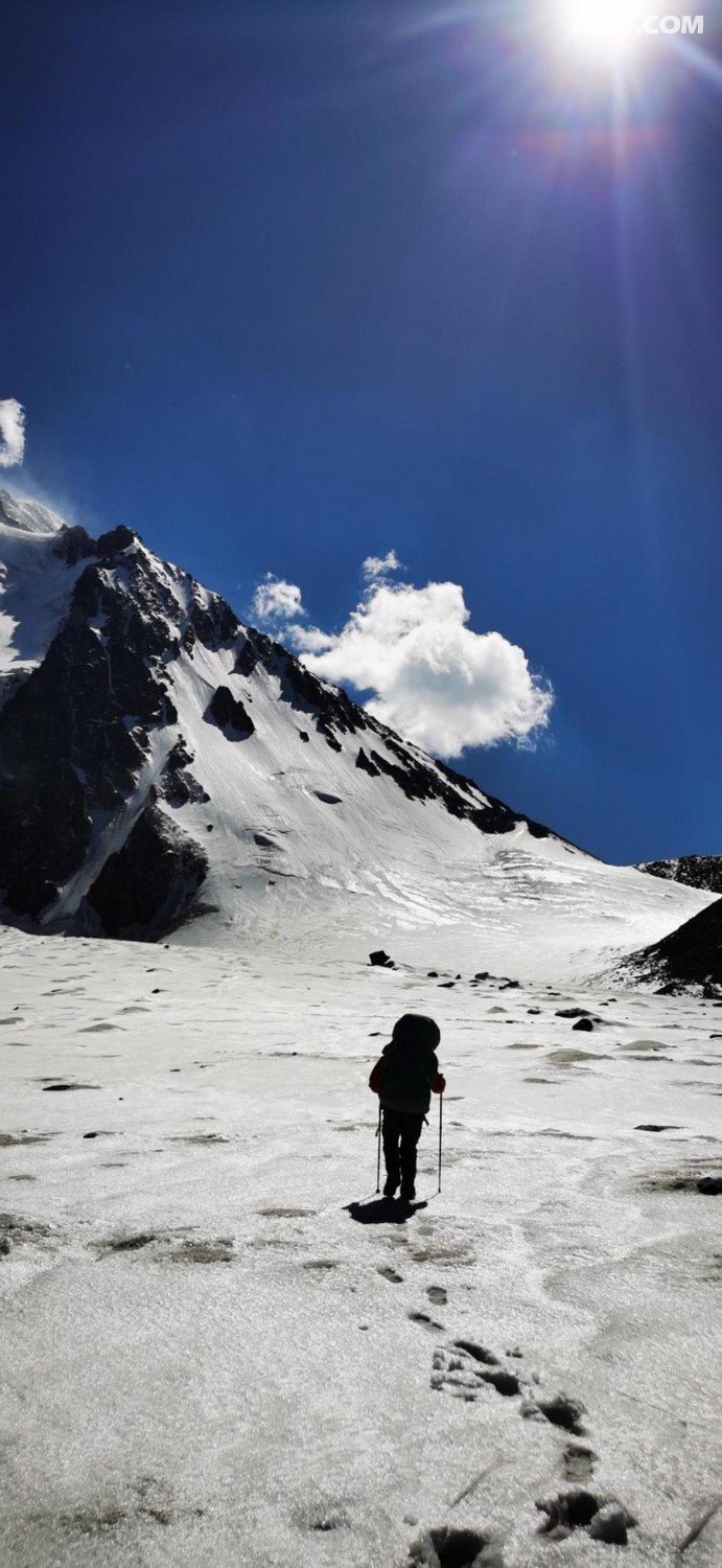 回拍:向左眺望,见远山积雪(拍摄时间:11:54 冉苒)我们傍着奔流的阿克苏河继续逆流而上,海拔在一步步中无声攀升,肩上的背包仿佛被无形的手不断加重。烈日当空,毫无遮拦地炙烤着谷地,更添了几分艰难。渐渐地,队伍的行进速度慢了下来,空气中弥漫着些许疲惫的气息。 两位郑州山友已渐渐跟不上我们的节奏,远远落在了后方。我、冉苒和咖啡三人只能不时轮流开路,全凭意志支撑着沉重的脚步。然而每当路边出现可以倚靠的巨石,我们还是忍不住卸下背包,瘫坐片刻,贪恋那短暂却珍贵的松弛。