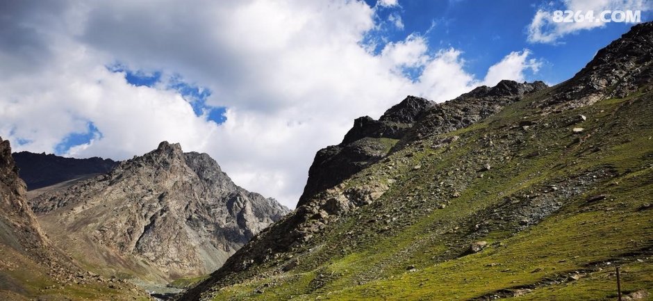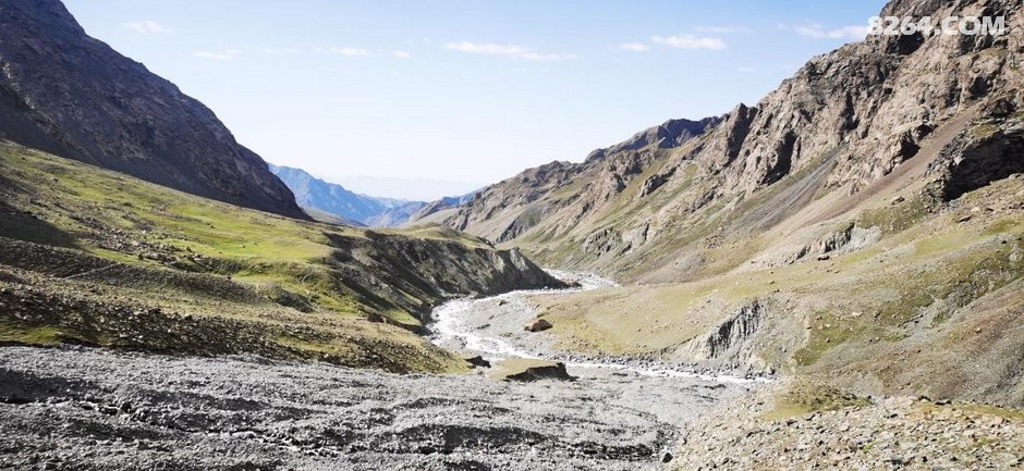 沿牧场的砂石路缓缓上行,眼前一道隆起的山脊将山谷分为两岔:左侧深邃,流淌着乳白色的阿克苏河,水势汹涌;右侧地势稍高,呈平缓的浅谷形态,虽没有明显溪流,却遍布流水冲刷的痕迹。