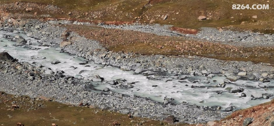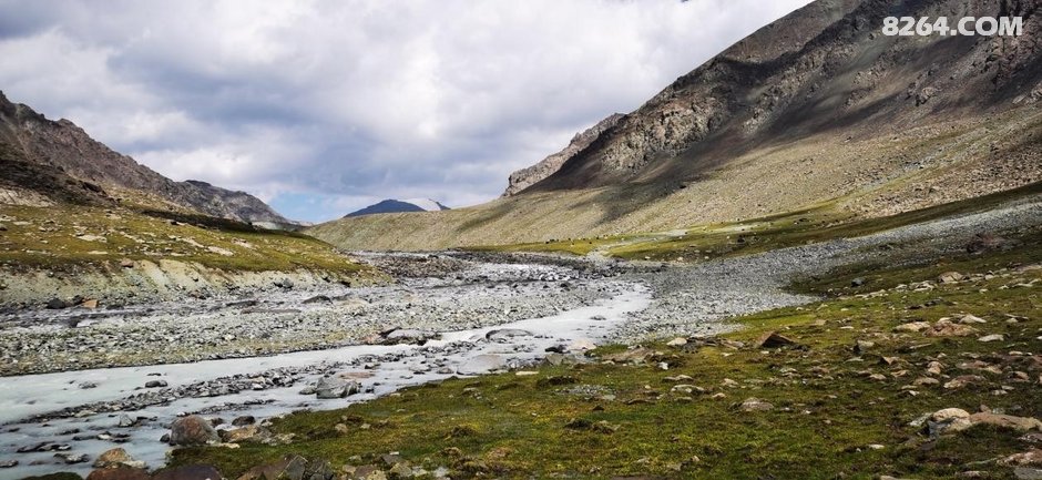 回拍 回望郑州山友(拍摄时间:13:32) 越往河流上游行走,谷坡越发平缓,河道也逐渐开阔。阿克苏河在此处悠然转弯,于石滩间划出一道优美的弧线,宛若大地的温柔笔触。目光越过河谷低缓的阶地向上游远望,已能隐约瞥见冰川末端那一片莹白的冰舌,静默地延伸向尘世。