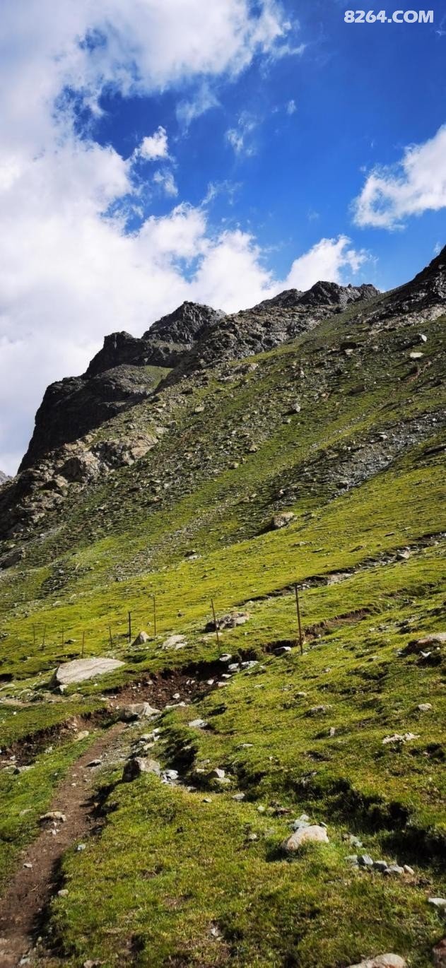 牧道顺着山势蜿蜒向前,大多相对平缓。唯有被流水冲刷出的陡坡面上遍布深深浅浅的冲沟,乱石参差,略显得崎岖。