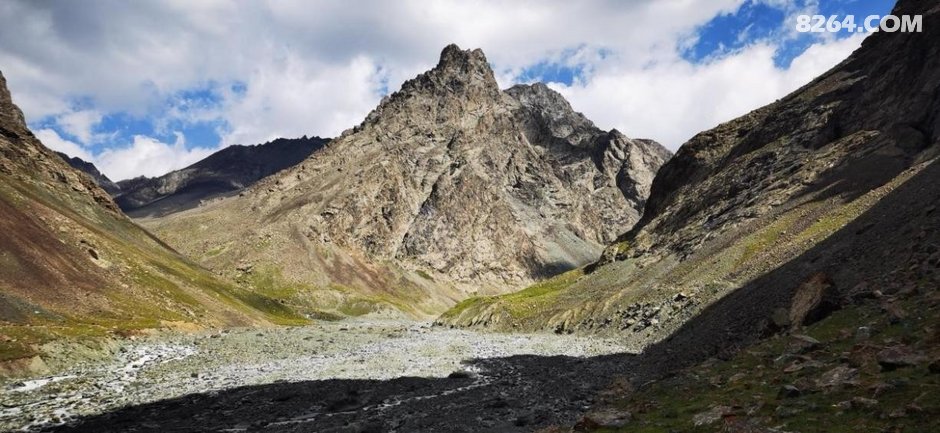阿克苏河 冰川融水汇成的河流(拍摄时间:10:38) 这段路程确实漫长,领先一段的郑州山友也逐渐显露出疲态。在一处牧屋岔路旁,我们再度会合,彼此相视一笑,重整队伍,继续朝着那座塔形山的方向并肩前行。