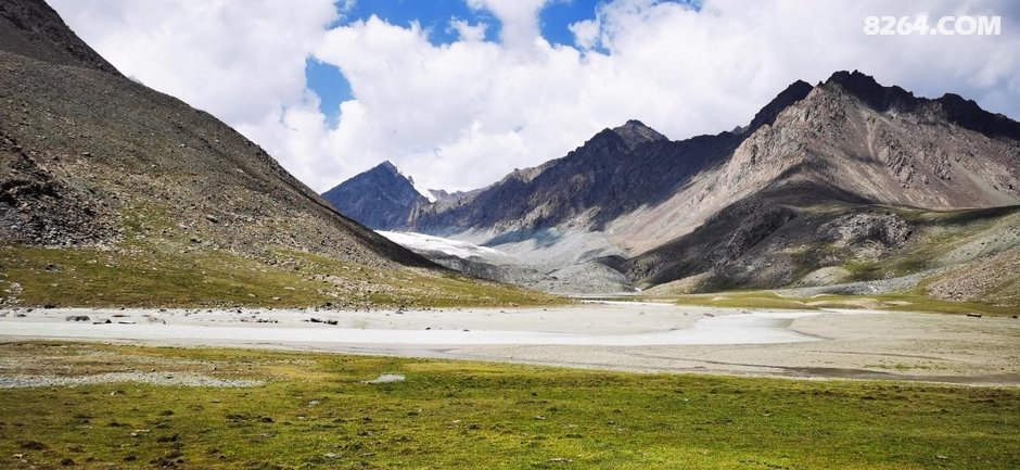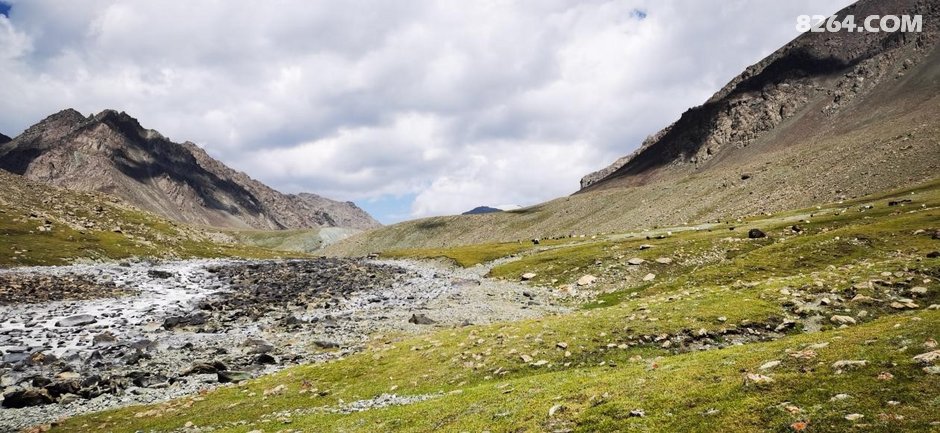 隐约可见冰川末端(拍摄时间:13:37)河谷缓坡之上,嶙峋石海静卧,高寒草甸却在其间肆意蔓延,如茵如浪,一直铺展至远山峰峦之下。我们踏着柔软而富有弹性的草甸,缓步移至河道转弯之处,一泓深藏的冰湖蓦然映入眼帘。蓝天倾泻,白云舒卷,山峦默立,草甸连绵,更有成群牛羊与骏马悠然徜徉——天地万物在此共绘一幅宁静而丰饶的画卷。
