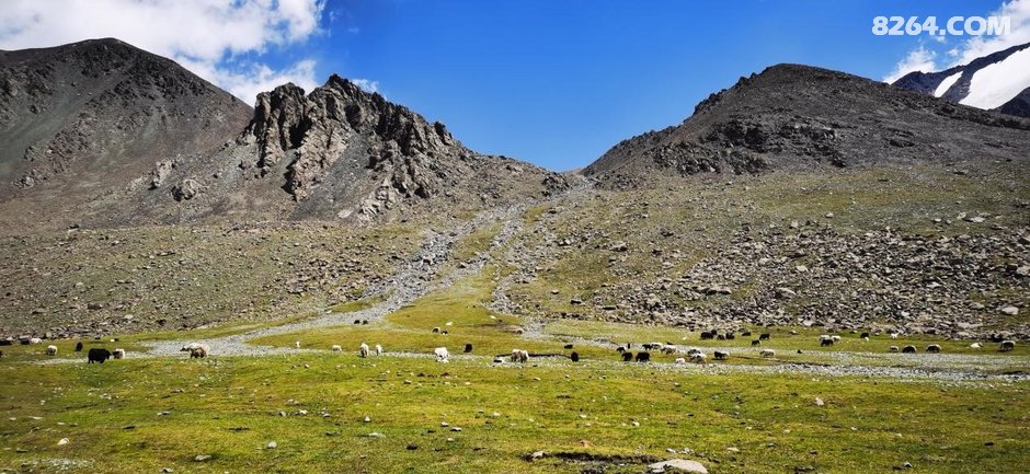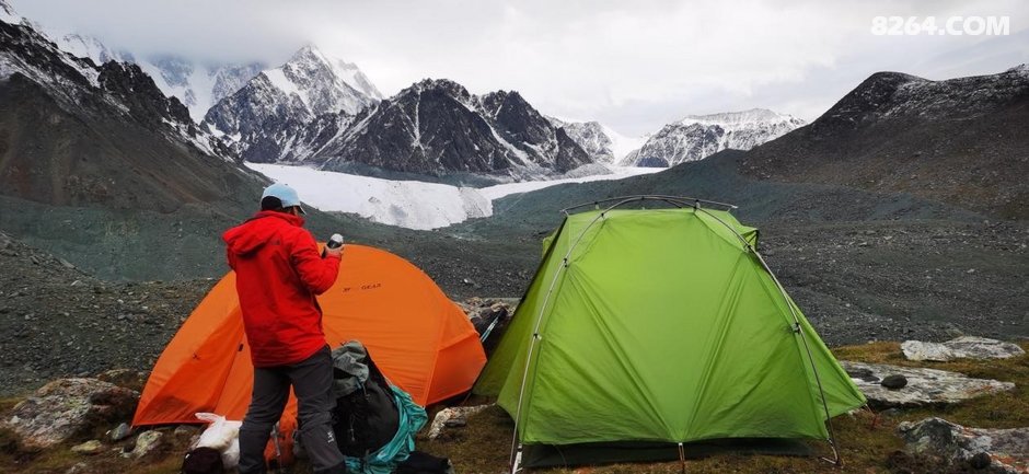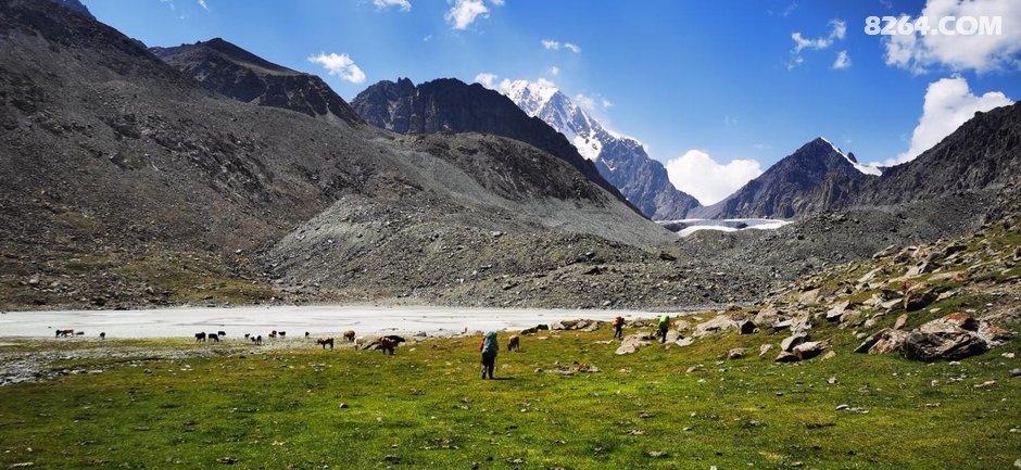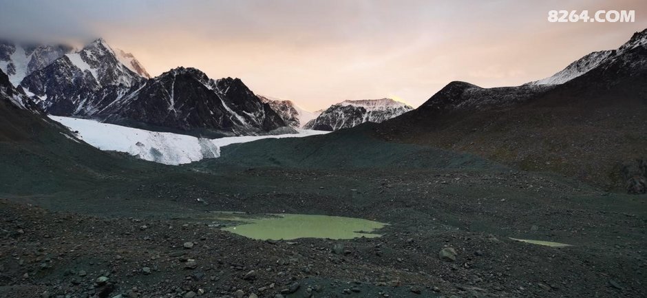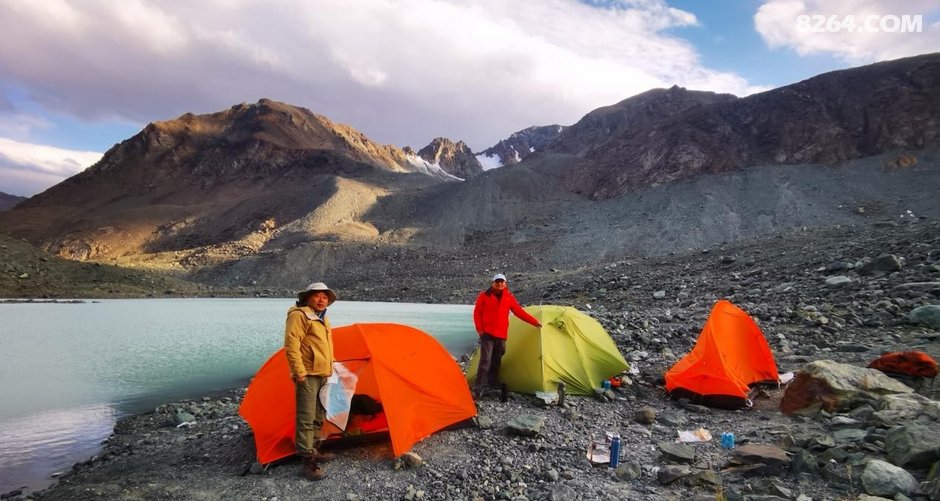 岩峰、积雪、冰川、冰河、冰湖集于一体(拍摄时间:18:29)从坡面俯瞰谷中,冰河、湖泊间似有若干沙洲。下到谷地,这些“沙洲”逐渐变得高大陡峻起来,原来竟是冰碛堆积而成的侧碛垄。转山达坂的高差之大,由此可见一斑。 冰河右侧坡麓和缓,牧草青青,牛羊点点,这便是白杨河西沟营地。营地并不理想,低平处积水严重,稍高处又块砾横陈。勉强觅得方寸之地,堪堪只能容下两个帐篷。于是,咖啡就得和我混帐。