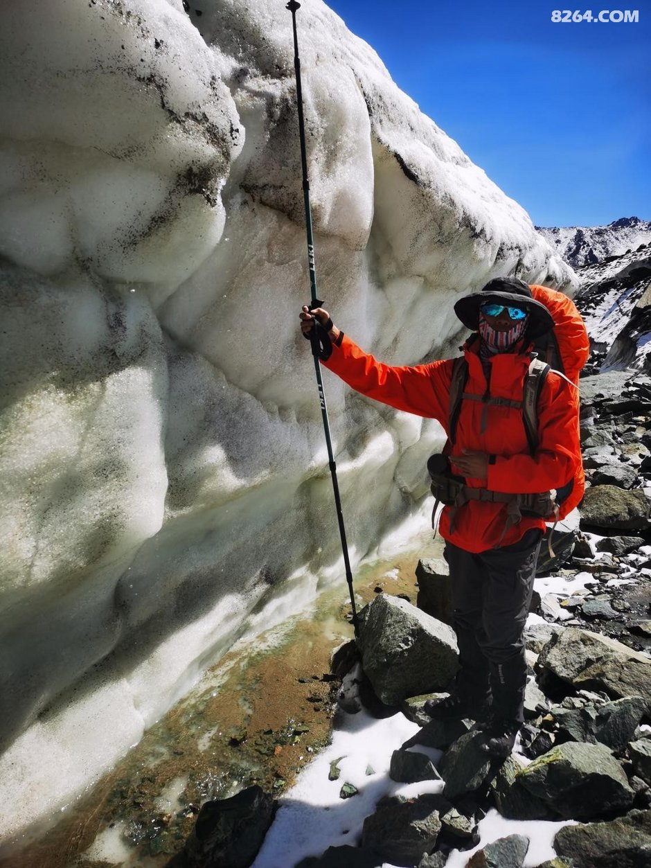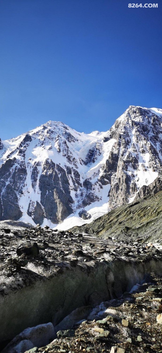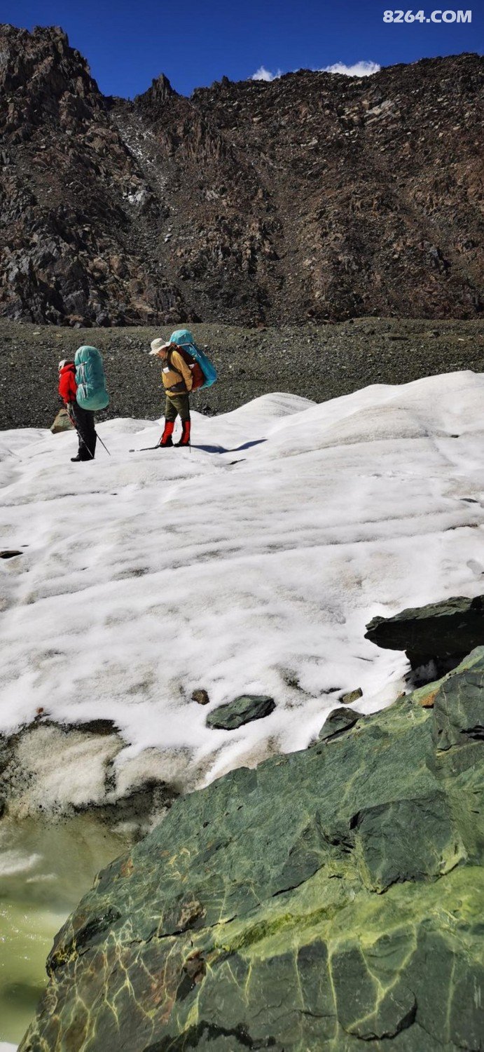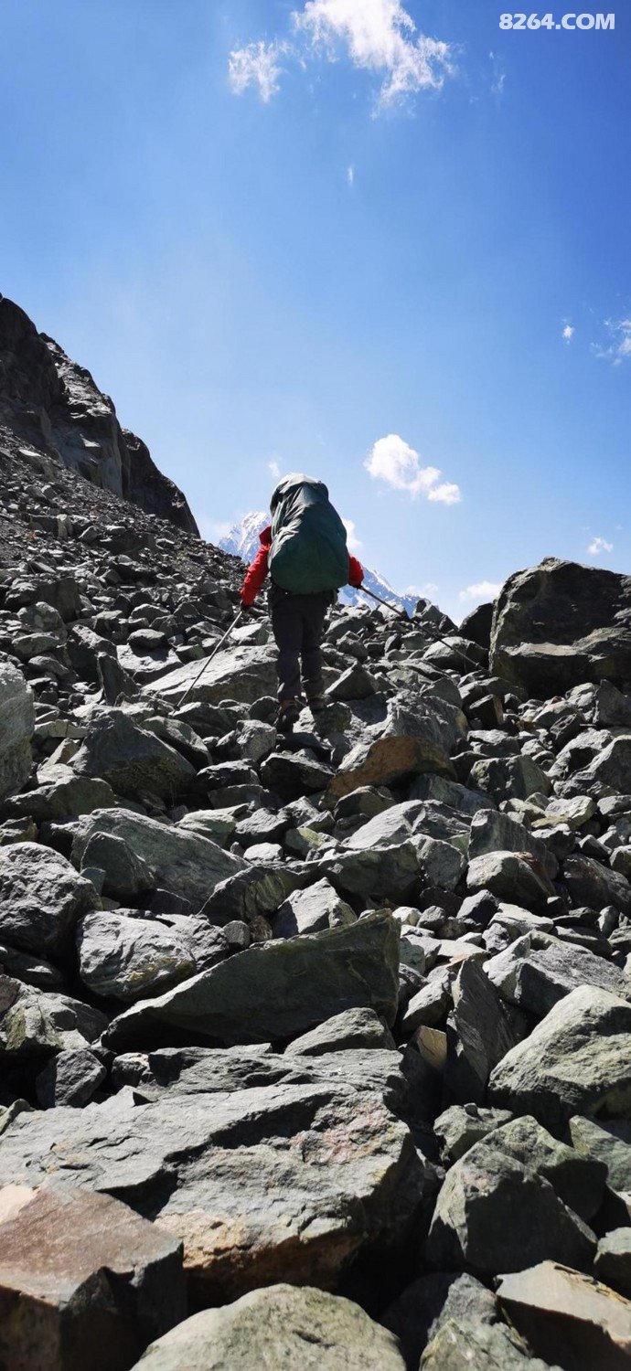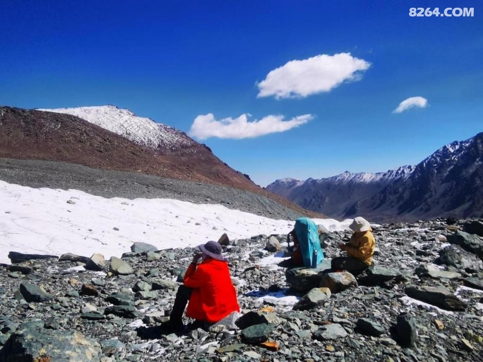 回拍:冰川萎缩露出冰碛石(拍摄时间:16:02 冉苒 ) 天空湛蓝如洗,蓝得近乎虚幻,唯有雪峰顶上飘着几团白云。阳光灼人,晒得人昏昏欲睡,但我们不敢耽搁——简单达坂还隐在蜿蜒的冰川尽头,不见踪影。