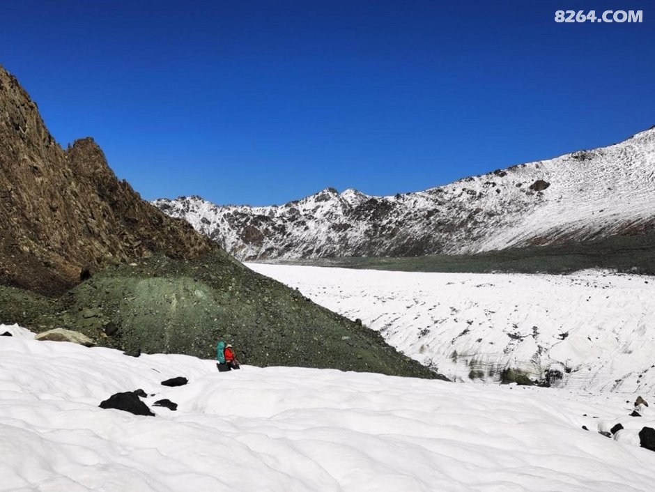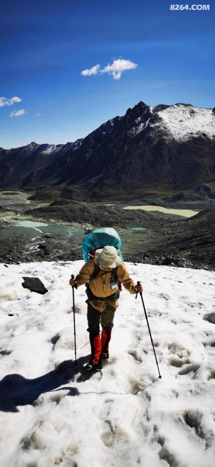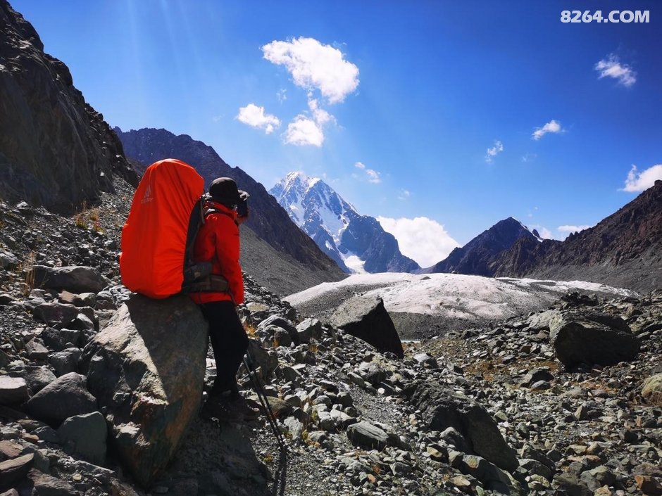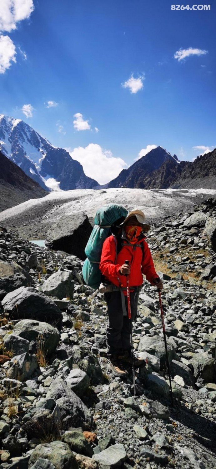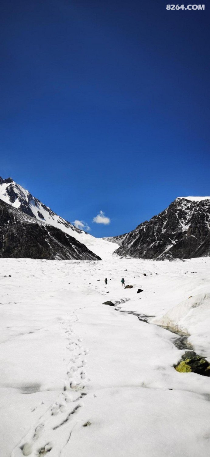 回拍:冰川萎缩露出冰碛石(拍摄时间:16:02 冉苒 ) 天空湛蓝如洗,蓝得近乎虚幻,唯有雪峰顶上飘着几团白云。阳光灼人,晒得人昏昏欲睡,但我们不敢耽搁——简单达坂还隐在蜿蜒的冰川尽头,不见踪影。