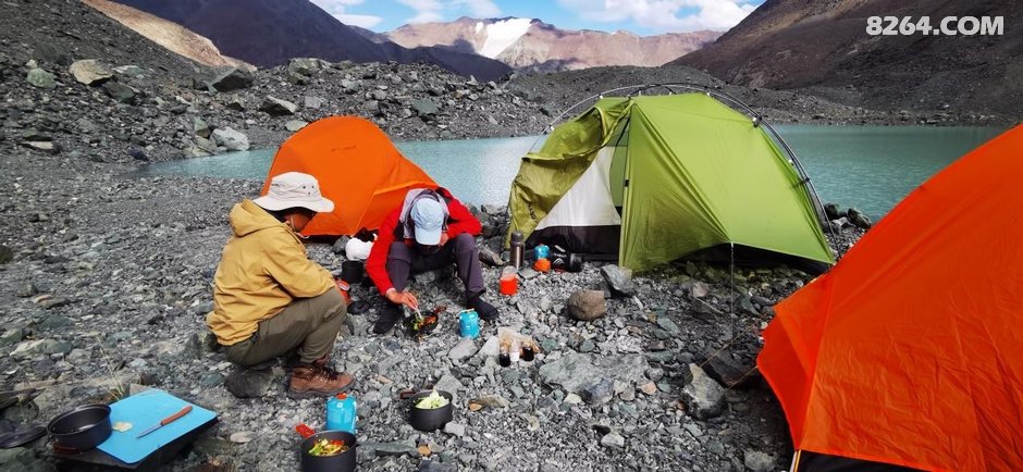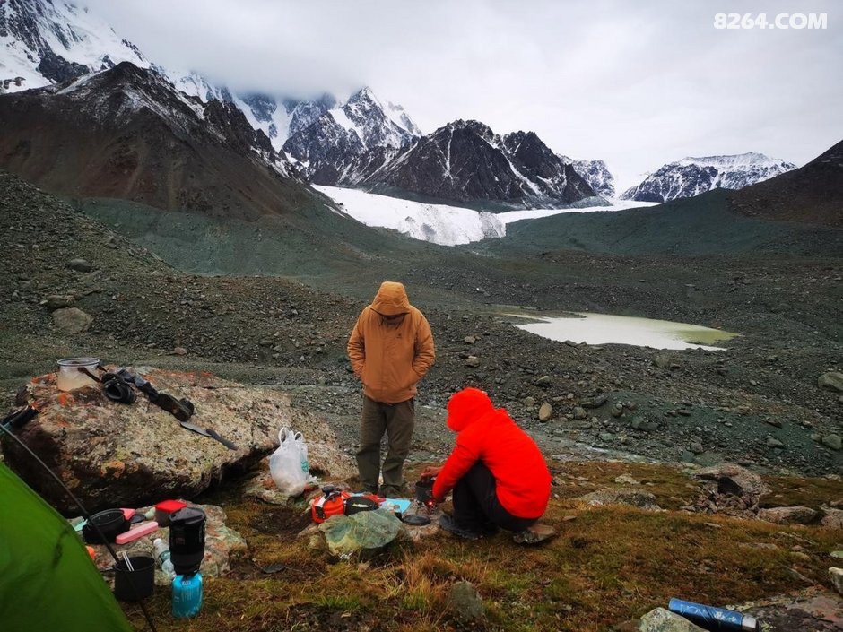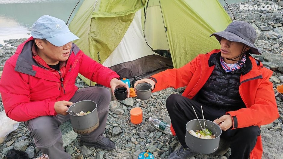 备餐(拍摄时间:20:20 冉苒) 夕阳缓缓西坠,霞光浸染天际。我们虽身处群山背面,无缘得见西边雪峰那“ 日照金山”的壮丽景象,却仍可见群峰的脊线被落日镀上一道璀璨的金边。营地南侧,一座雪峰突出的山腰间,也被悄然抹上一缕流动的褚红,如同大自然温柔的手笔,为这苍茫天地添上一抹神性的光辉。