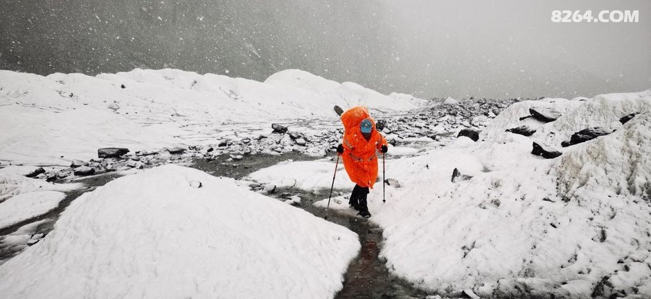 我们依据积雪颜色与形态谨慎判断前路:洁白饱满之处,往往积雪深厚,其下常有冰水暗涌、陷阱隐伏;而呈现浅黄并夹杂暗黑斑块的区域,则通常冰体密实、地面坚硬,那是隐伏的冰垄在为我们无声指引方向。我们只能凭借这些细微的征兆,辅以登山杖一次次探测试验,小心选择每一步的落点,在这虚实交错、明暗交织的冰水迷宫中迂回前行。