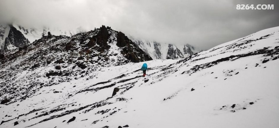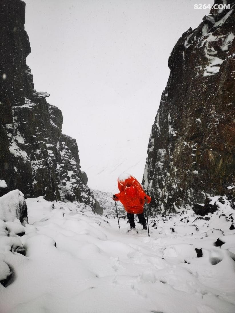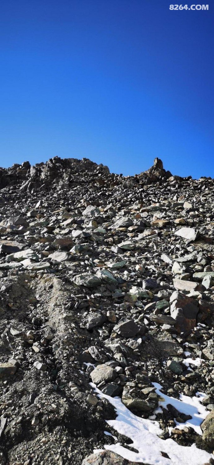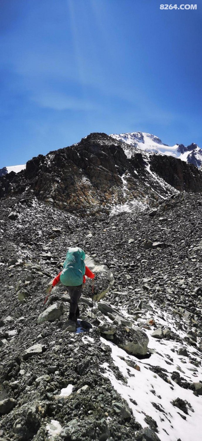 冉苒在前探路,坡上松动的碎石突然滑落,在他头顶数米处停住,惊得我和咖啡失声惊呼。此刻必须眼观六路、耳听八方,更要专注脚下。每一步都引发碎石哗啦滑落,斗大的块砾滚至冰川,被积雪阻滞。