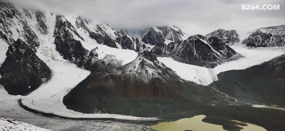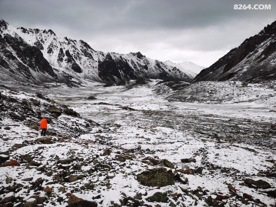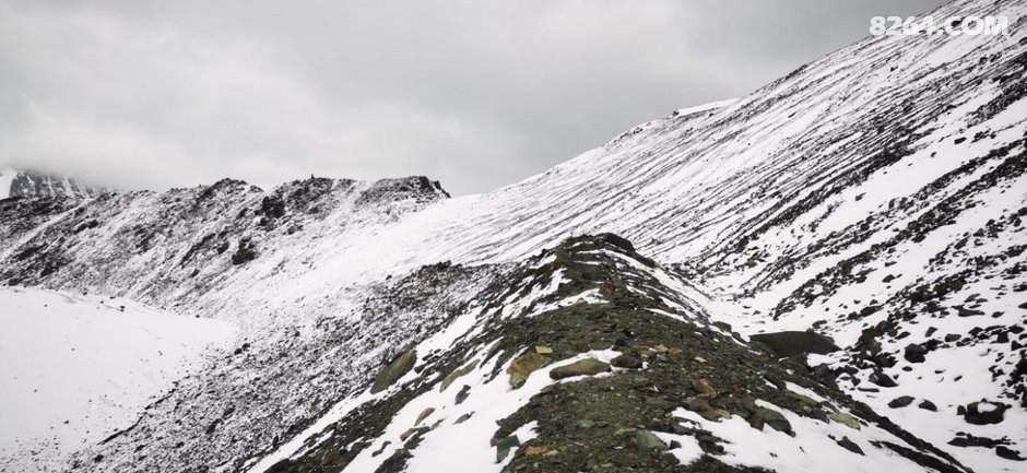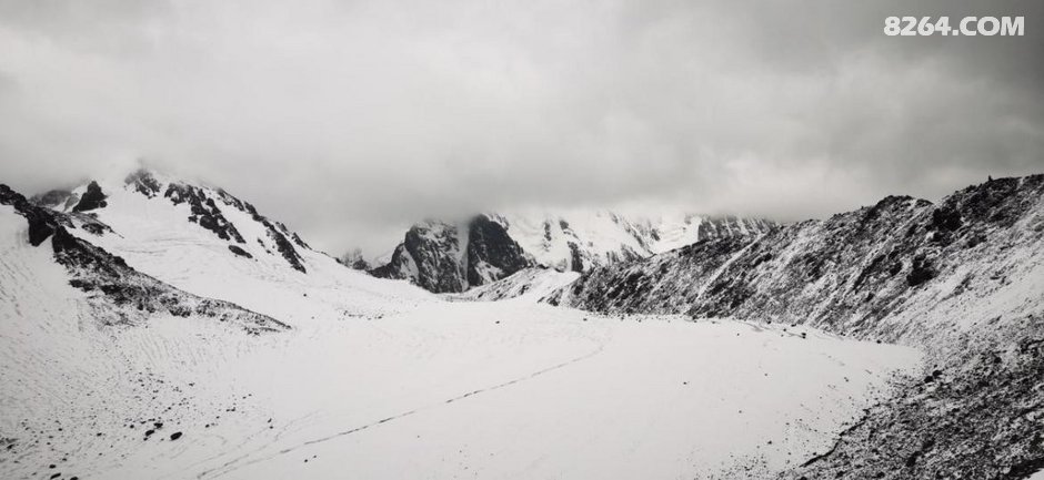 (拍摄时间:10:17) 继续直上冰碛缓坡,起伏不大的几道冰碛堤不规则地分布于谷底坡面,被冰雪融水形成的径流切割得支离破碎。宽谷两侧的山峰下,坡麓堆积的碎石呈现出一片暗灰色,如缠绕山体的恐怖缎带,连绵不绝地夹持着中间那道静默的冰川。