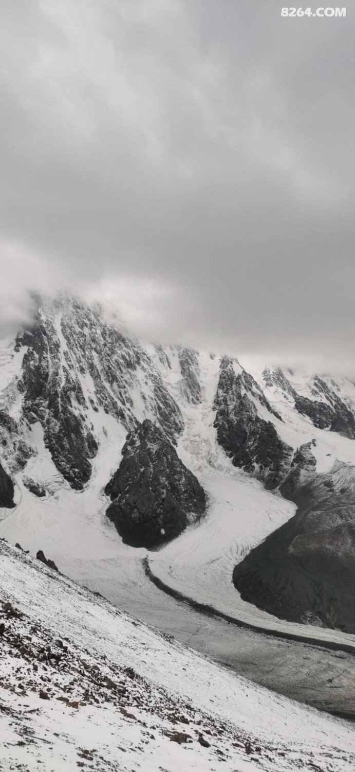 岩石破碎的山体,狰狞恐怖(拍摄时间:17:53)越往上行,碎石坡愈发陡峭,近乎垂直,犹如一道绝壁横亘眼前。我们不得不转向一侧紧邻的陡峭冰川继续攀登。 冰面湿滑难行,道道冰河如银蛇般蜿蜒阻路。我们轮流上前开路,凭借登山杖在冰面上艰难维持平衡。每一步都深深嵌入雪层,脚趾紧紧扣住冰面,朝着达坂的方向一寸寸艰难挪移。