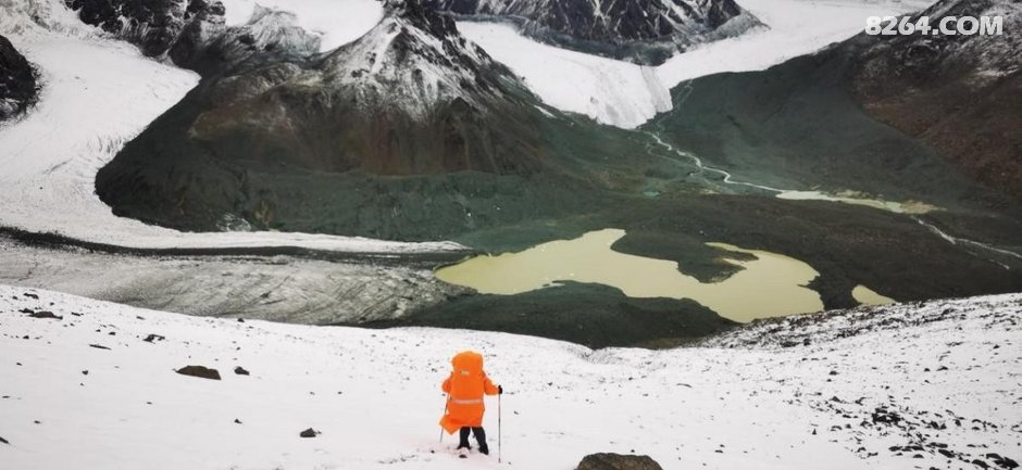 南侧雪峰和冰川(拍摄时间:9:33)冉苒查看了轨迹,随后带着我和咖啡踏上了冰川。经过盛夏的持续消融,冰面嵌满了暗黑的砂砾,掺杂了泥沙的冰体失去了往日的洁白,显出一种粗砺甚至有些丑陋的形态。早上的表碛和雪粒凝结成硬壳,踩上去有些湿滑。我们与冰岸保持着安全距离,仔细审视冰面状况,一步步缓踏横穿。 在冰川边缘迂回绕开冰坎和深沟,较为轻松地抵达块砾堆积的湖岸。冰川下暗涌的冰河在冰坎裂缝处显露真容,水流湍急汹涌,直冲湖中,发出沉闷而持续的轰鸣。