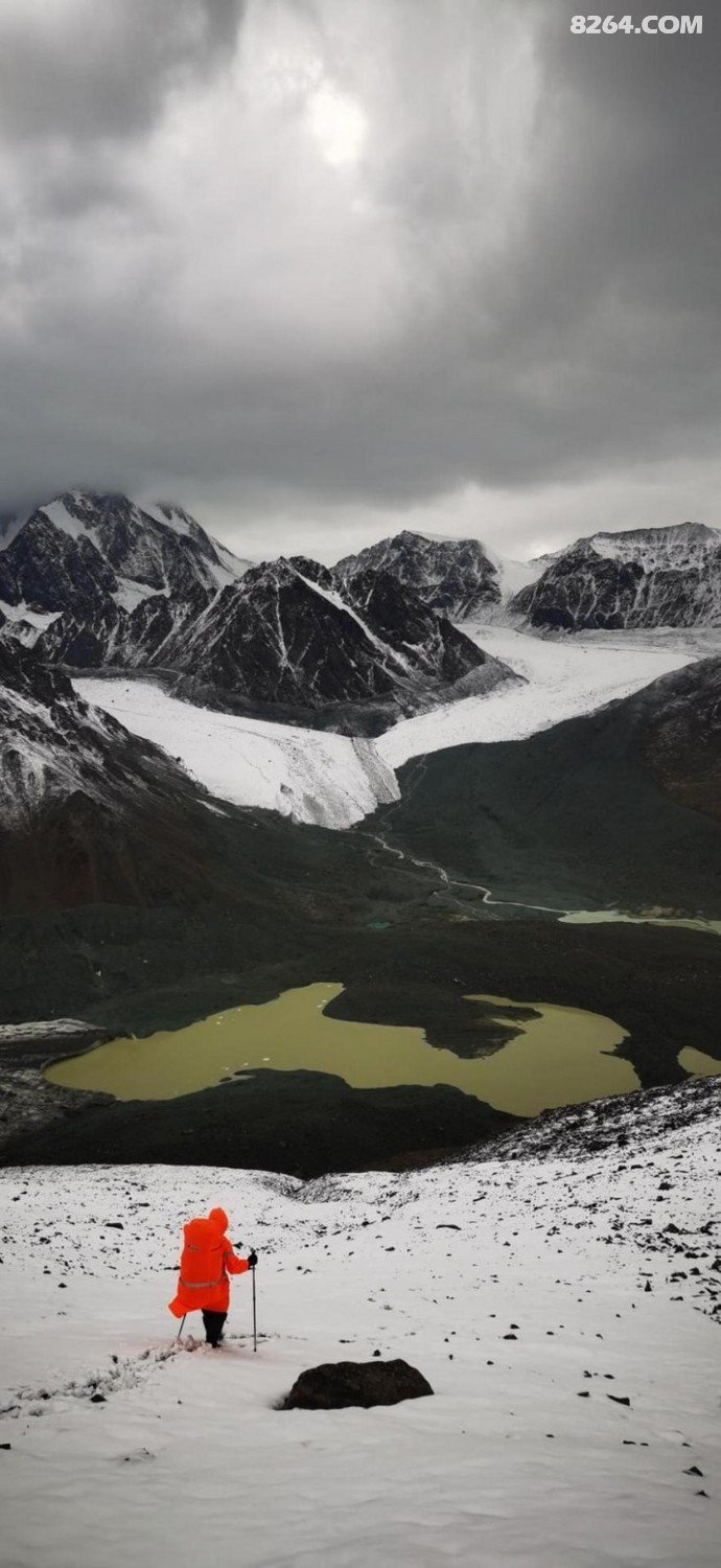 冰川群和冰碛湖(拍摄时间:18:15) 然而征程尚未结束。前方是令人望而生畏的长陡下坡,积雪遍布、坡度陡峭,每一步都需格外谨慎。我们重心后仰,步子细碎,借助登山杖支撑,小心翼翼地在陡坡缓行。膝盖承受着持续的压力,脚趾在鞋内紧紧蜷缩,以对抗下滑的惯性。
