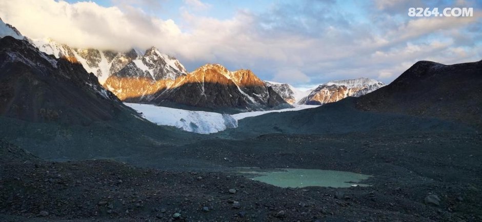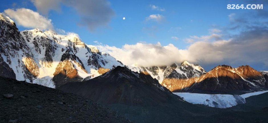 营地南侧的雪峰(拍摄时间:21:05) 今日徒步行程:自阿克苏小冰湖启程,穿越阿克苏冰川与白杨河东沟,翻越转山达坂,最终抵达白杨河西沟营地。徒步总里程11公里,累计上升950米,下降950米。04 从白杨河西沟营地到博格达北大冰川上方碎石营地