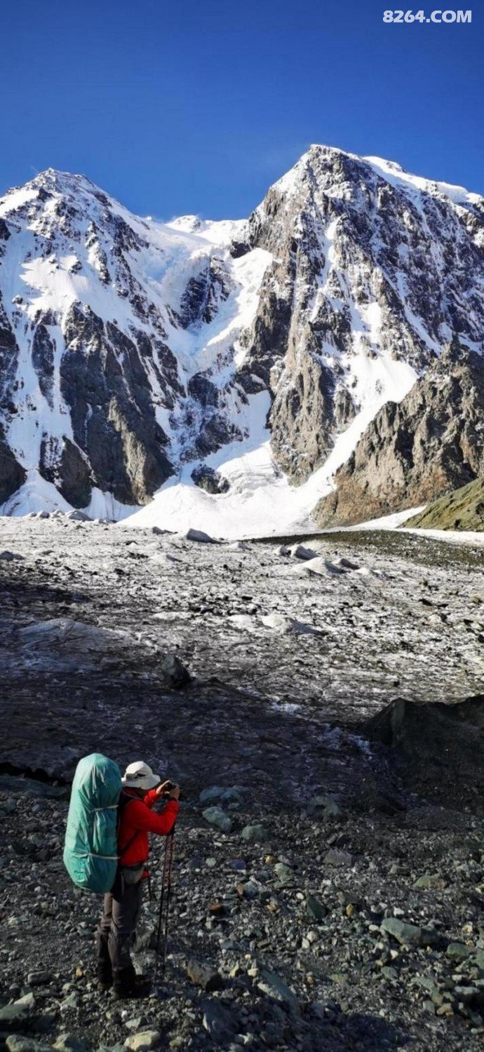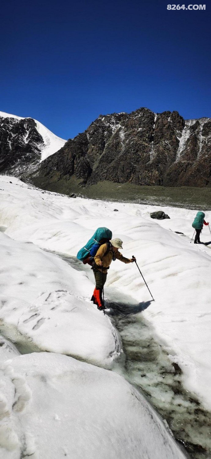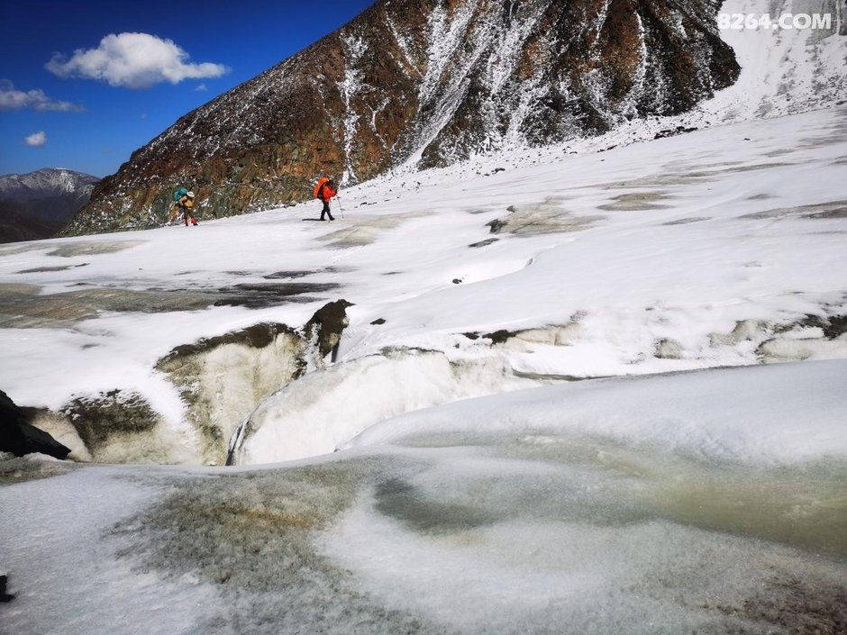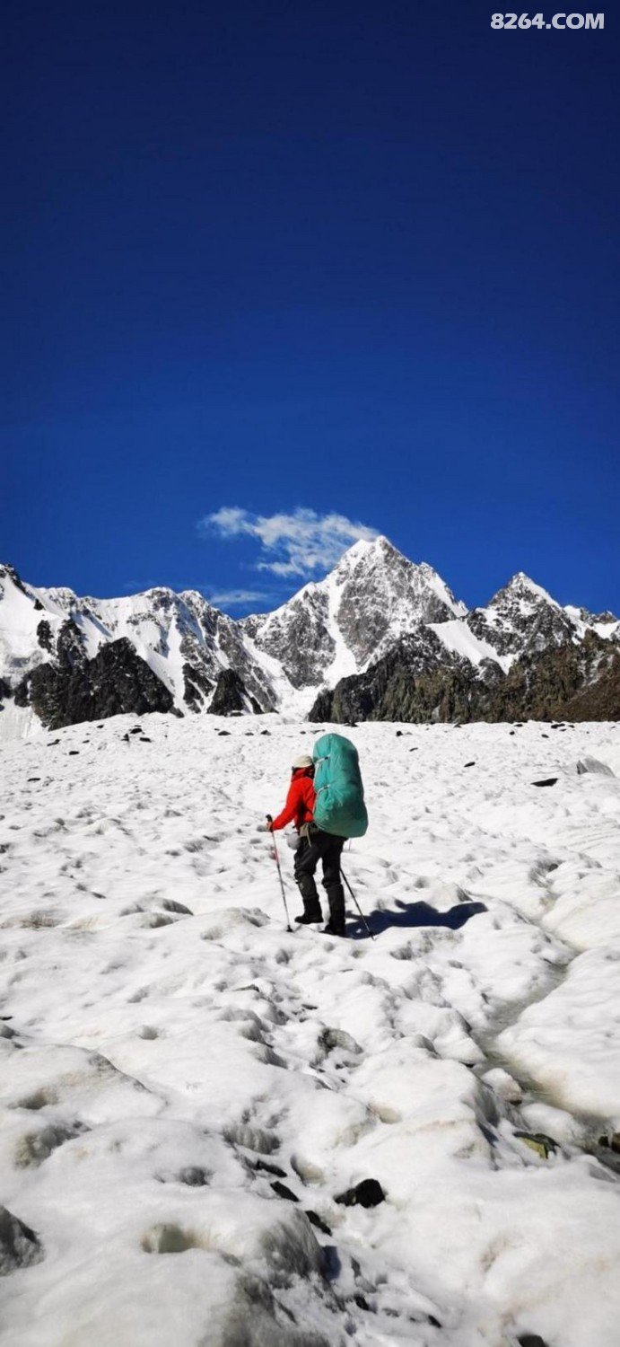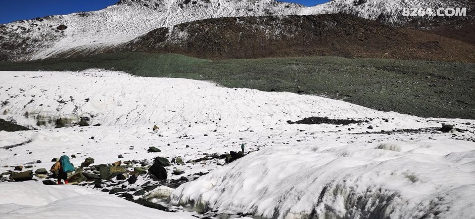 (拍摄时间:13:19) 我们只能完全按照轨迹线路在冰面来来回回行走,不敢偏离半步,否则就会被困在冰河和冰裂缝编织的网里,摆脱不了困境。我再次质疑:为何不走右侧山下的侧碛垄?日头炙烤,冰面的积雪融化,冰水渗透徒步鞋,连防水袜也抵挡不住持续不断的浸泡。