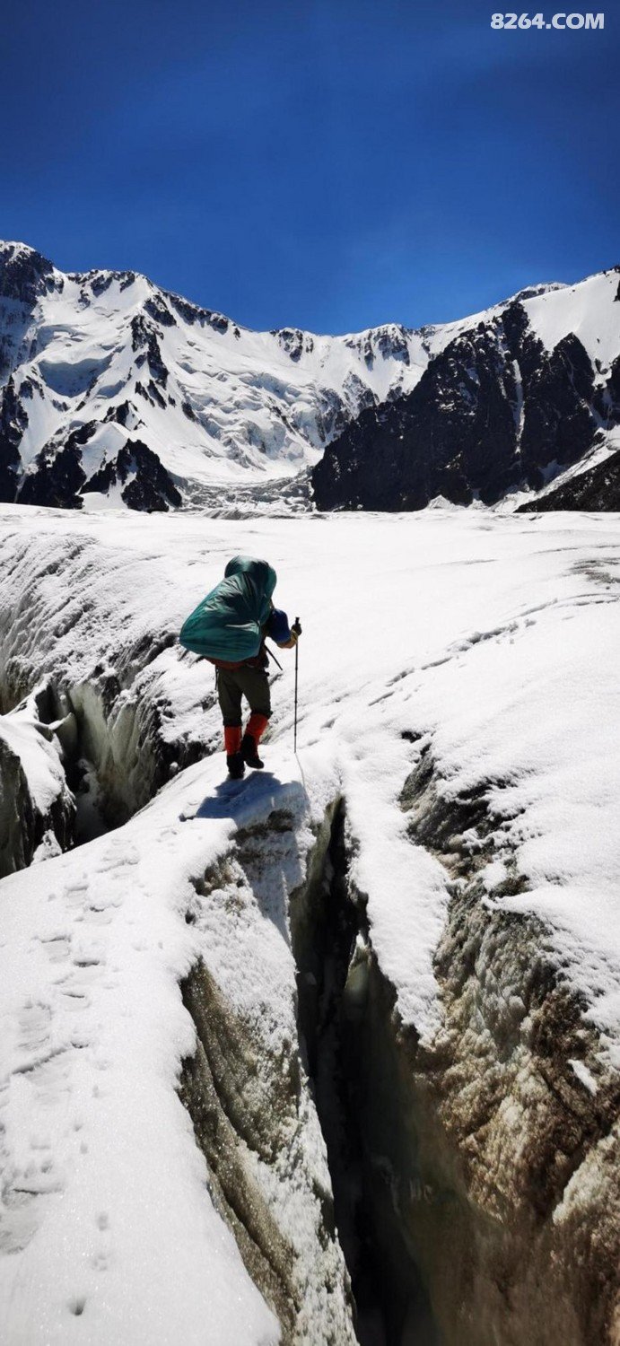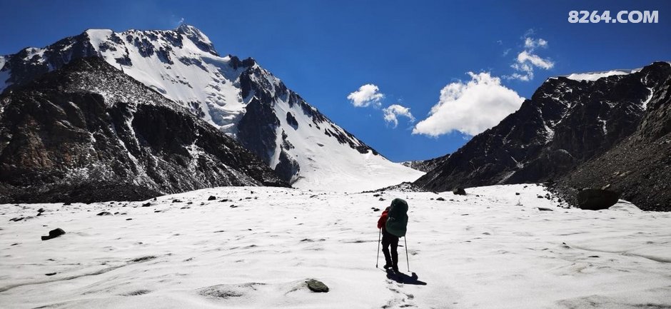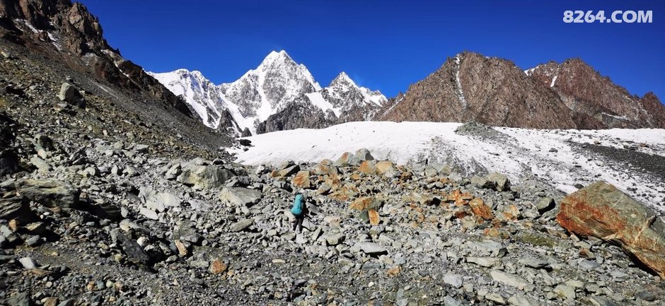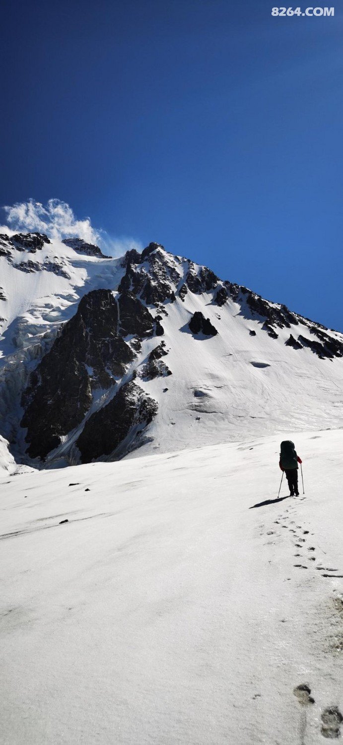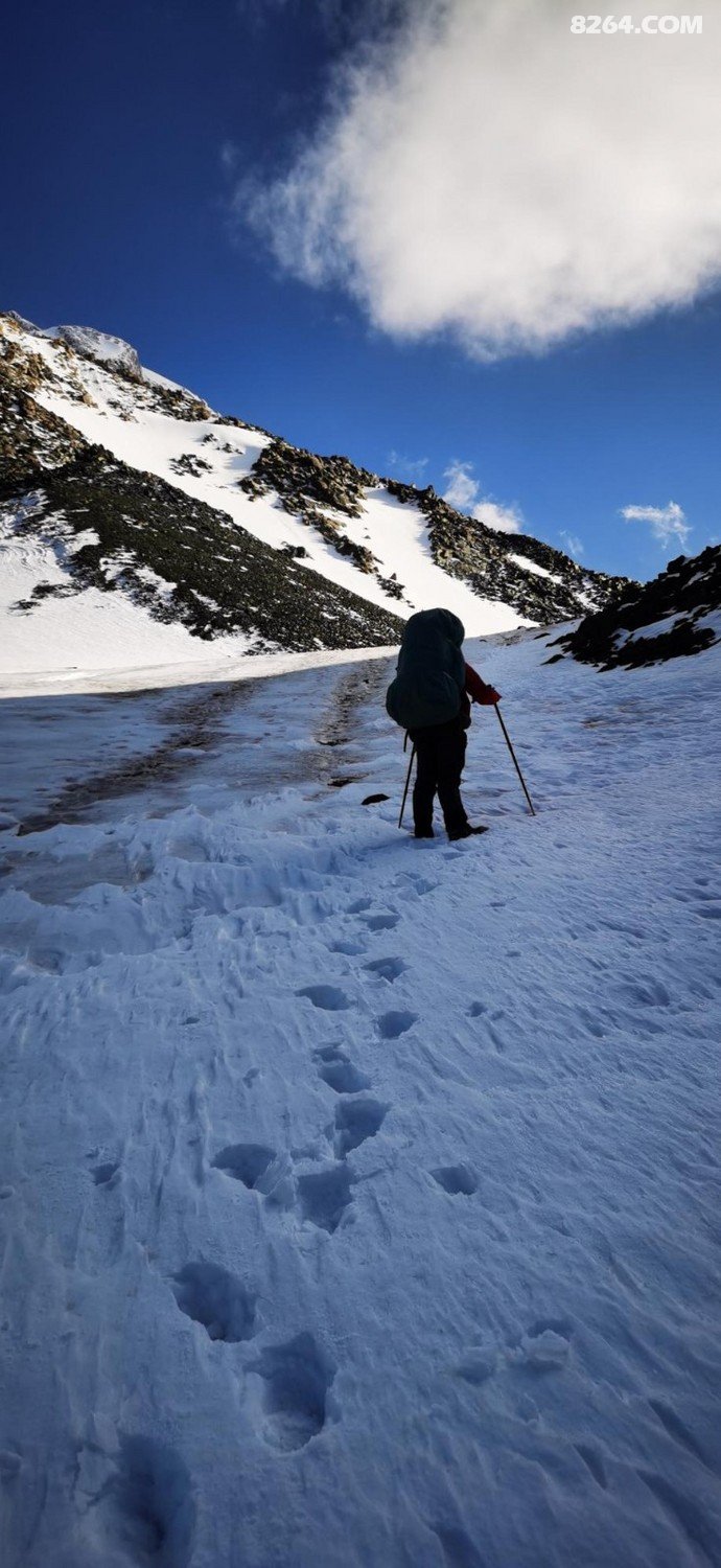 (拍摄时间:13:19) 我们只能完全按照轨迹线路在冰面来来回回行走,不敢偏离半步,否则就会被困在冰河和冰裂缝编织的网里,摆脱不了困境。我再次质疑:为何不走右侧山下的侧碛垄?日头炙烤,冰面的积雪融化,冰水渗透徒步鞋,连防水袜也抵挡不住持续不断的浸泡。