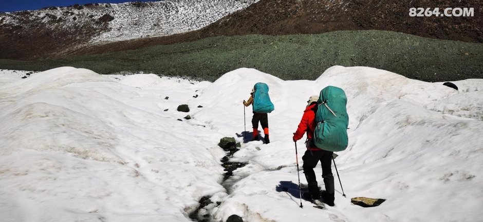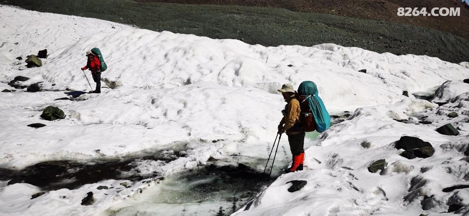 过河点:横跨冰河的巨石(拍摄时间:15:30) 行走在这第三条冰川之上,午后的高温使积雪覆盖下的冰面不断融化,除却表面纵横交错的坡面径流,更隐藏着积雪之下暗涌的潜流和难以察觉的深洼。冰川远看平阔,近行却步步暗藏玄机。我们深一脚浅一脚,不知经历了多少次的踉跄与趔趄,才逐渐摸索出一点行路的窍门。