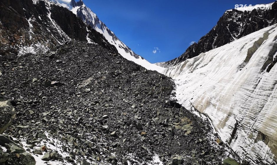 冰川上的冰裂缝和山峰下的碎石坡(拍摄时间:11:16) 行走在这变幻莫测的冰原上,仿佛踏入了自然的迷宫。每一步都需凝神屏息,心神紧绷如弦——既要提防脚下暗藏的裂隙,又要时刻平衡身体,避免在湿滑的冰面上失足。精神上的消耗,远甚于体力的透支。